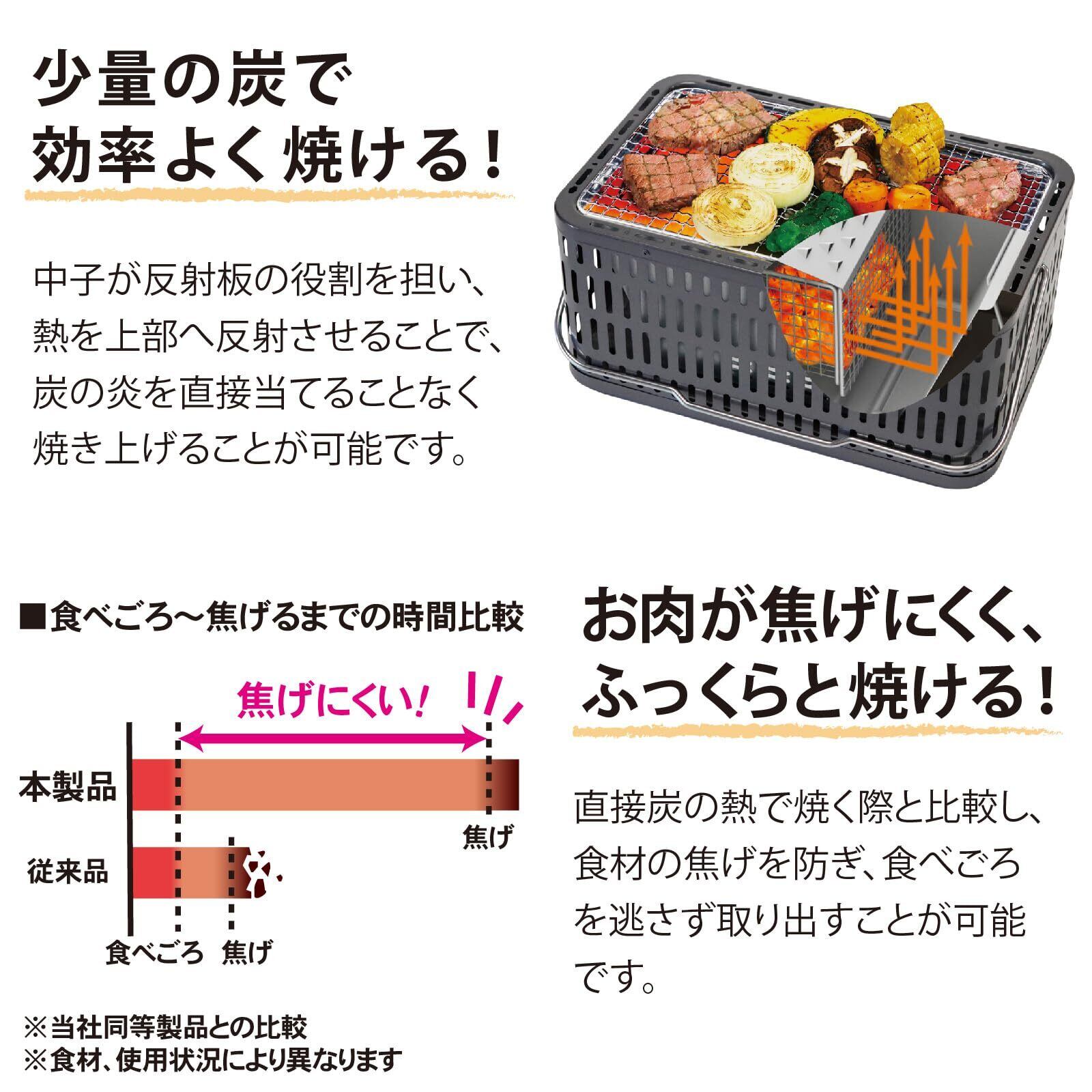 少量の炭で効率よく焼ける、反射板を利用して熱効率がよく、少ない炭で使用できる。