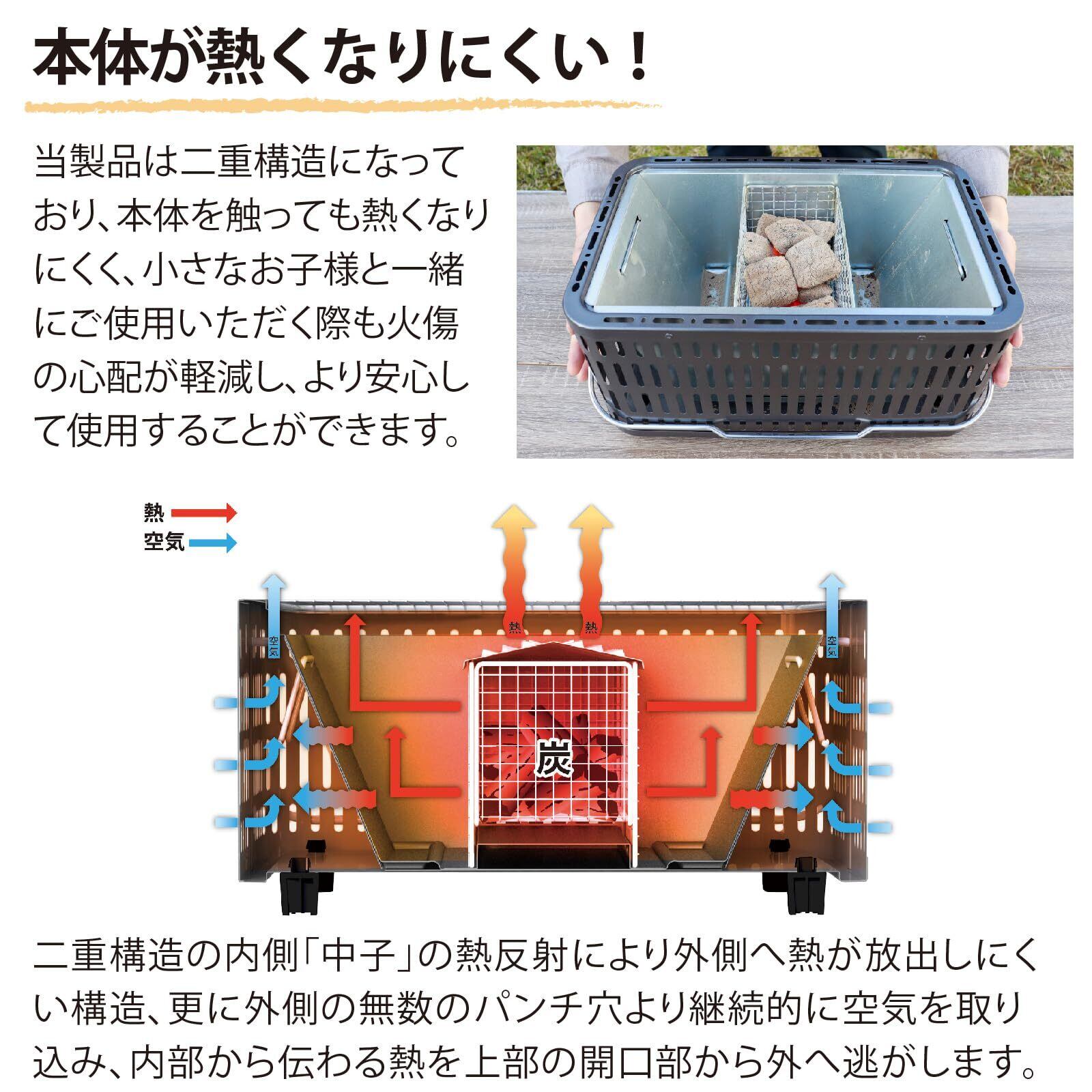 【本体が熱くなりにくい】空冷断熱方式の二重構造により、本体を触っても熱くなりにくくなっております。小さなお子様と一緒に使用される際も火傷の心配が軽減します。ブルーシートや机の上での使用も可能です。