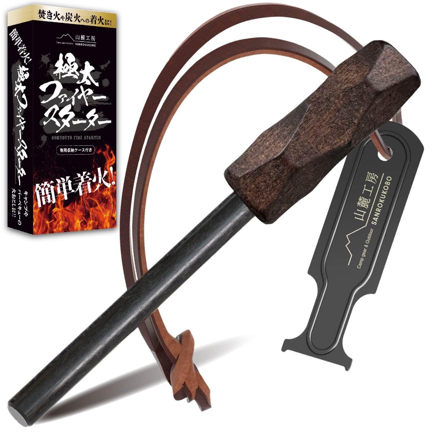【在庫限り】山麓工房 極太 ファイヤースターター 簡単着火 無期限メーカー 大きい フェロセリウム 収納ケース付き 火打ち石 キャンプ BBQ 火起こし 着火 (ダークブラウン)
