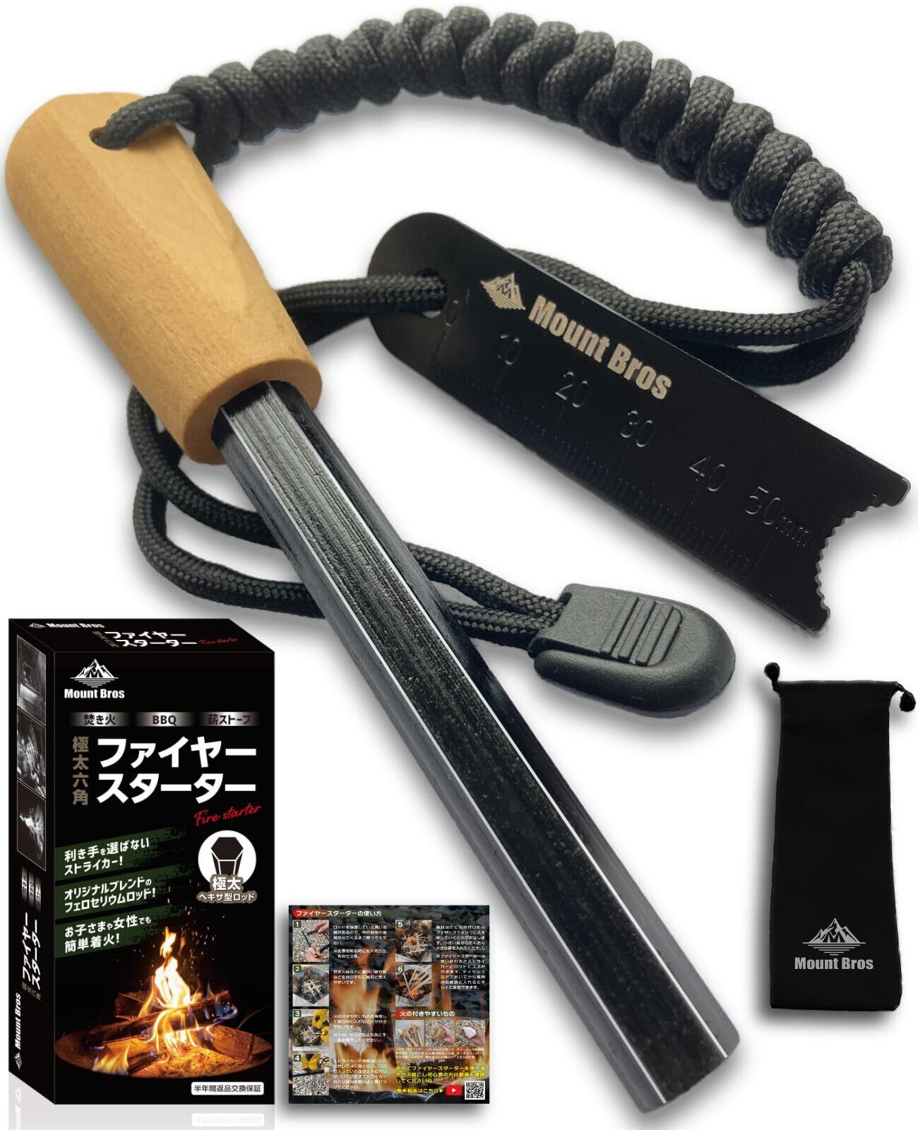 【数量限定】ファイヤースターター 【キャンプのプロ推薦!】 MountBros フェロセリウム 六角 極太 長い メタルマッチ 取説 収納袋セット 半年返品