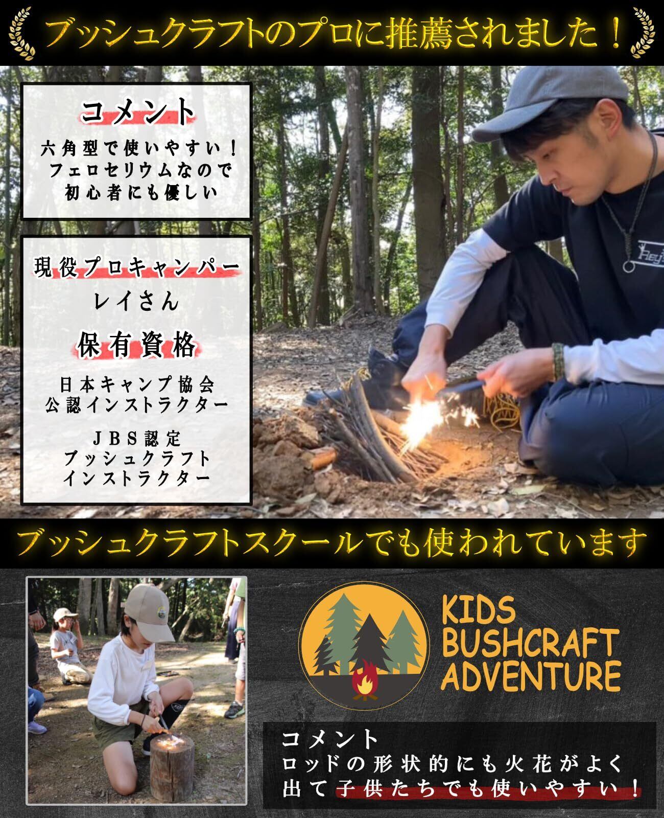 MountBrosの極太で長い六角ファイヤースターター(メタルマッチ)は圧倒的な着火力で大量の火花が出ます。ウッドグリップの持ち手付きで握りやすいため、力が入りやすく滑りにくいです。ヘキサ型(六角)で削りやすいので女性や子供でも簡単に着火できます。