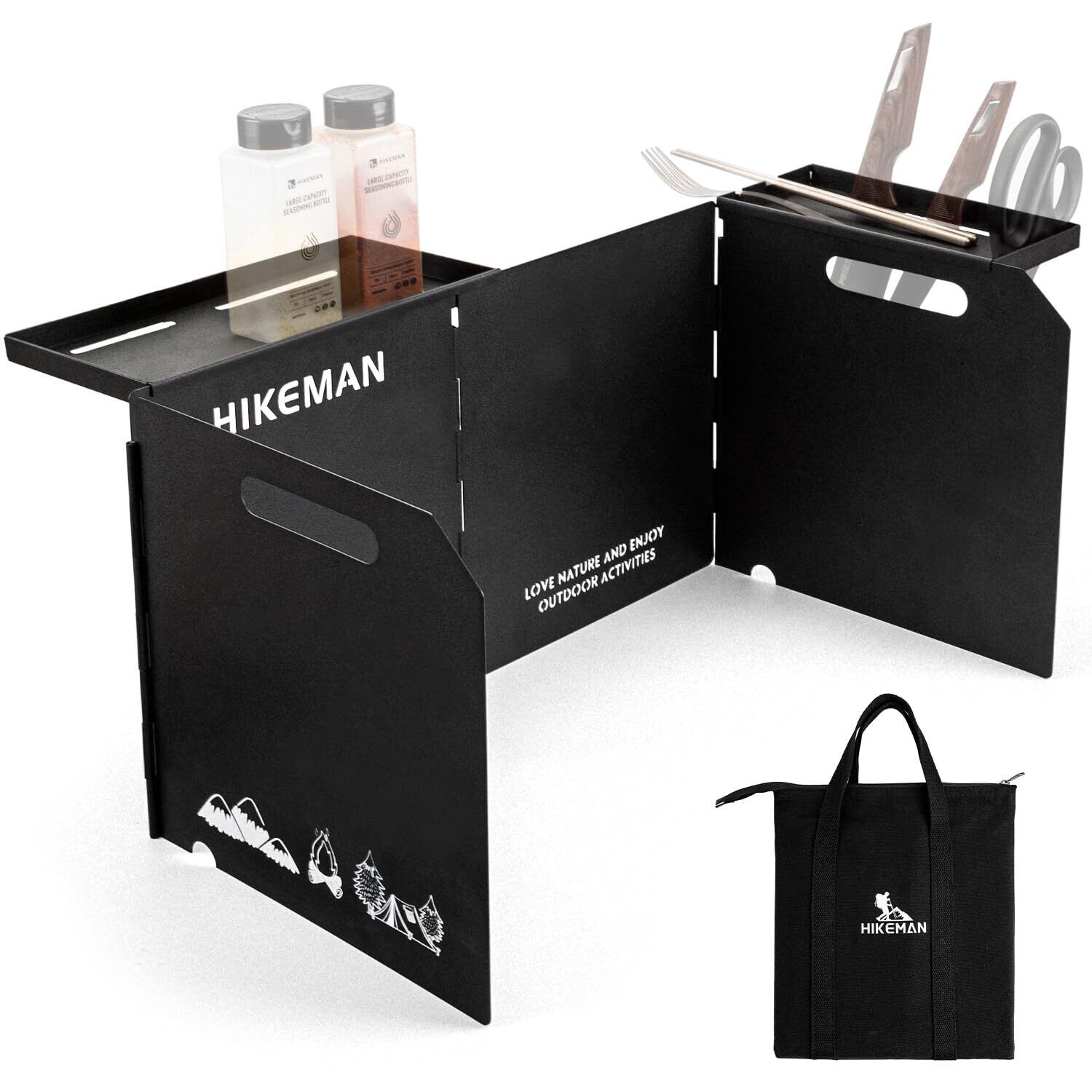 【特別価格】ウインドスクリーン 風防 キャンプ ウィンドスクリーン コンロ 風除け 強風に耐える 位置調整できる棚板 倒れにくい 折りたたみ式 小型 高さ25cm 収納袋付き ストーブ コンロ用風防板 黒 炭素鋼板 キャンプ用品 (ブラック)