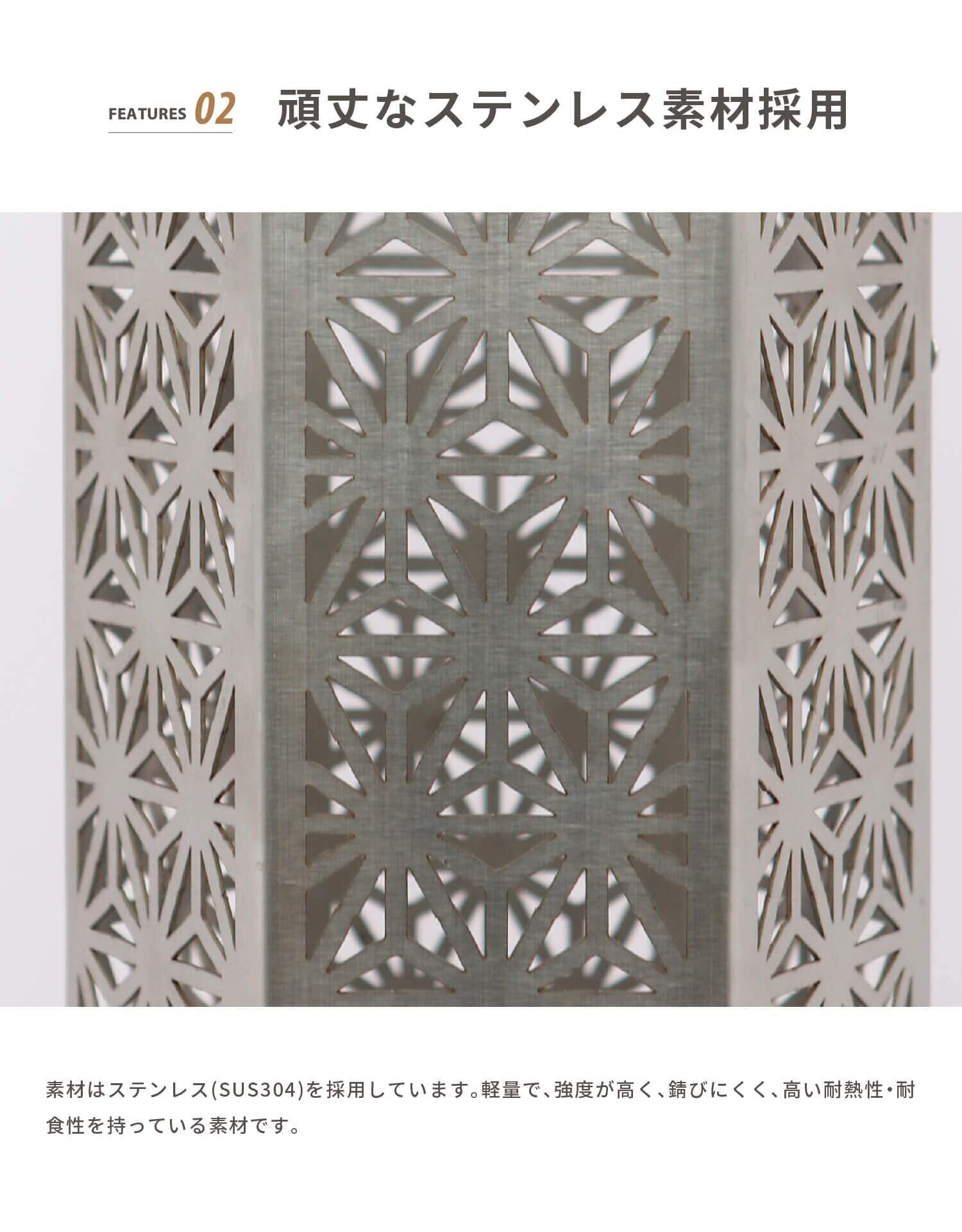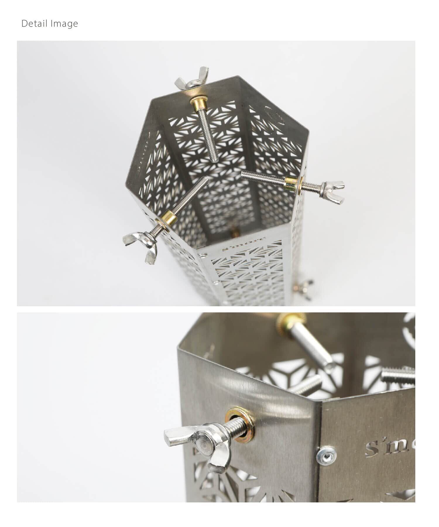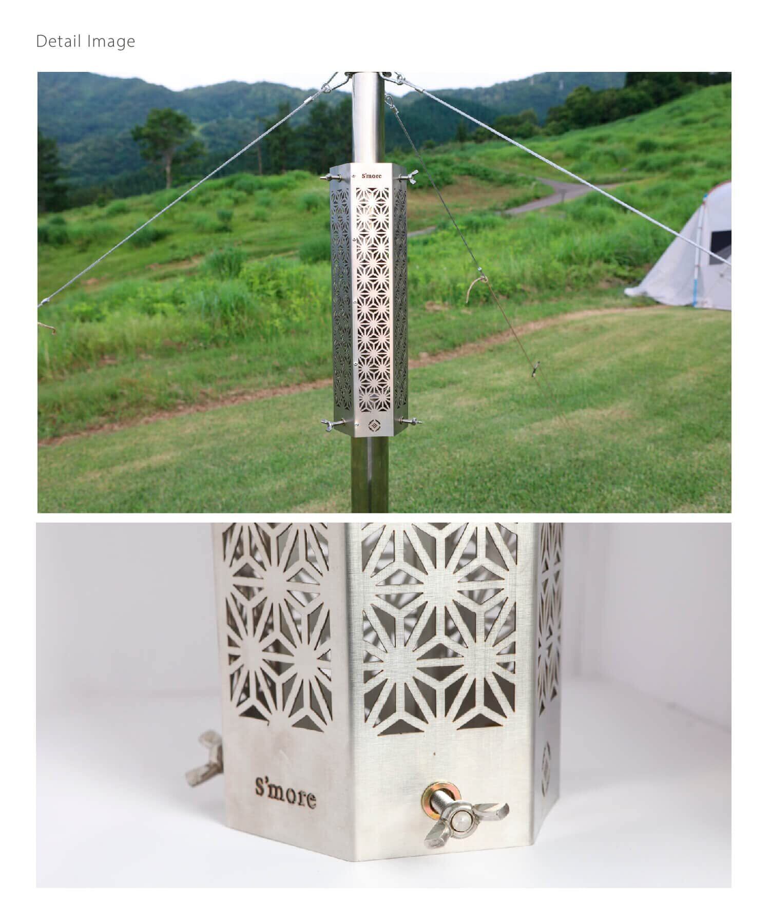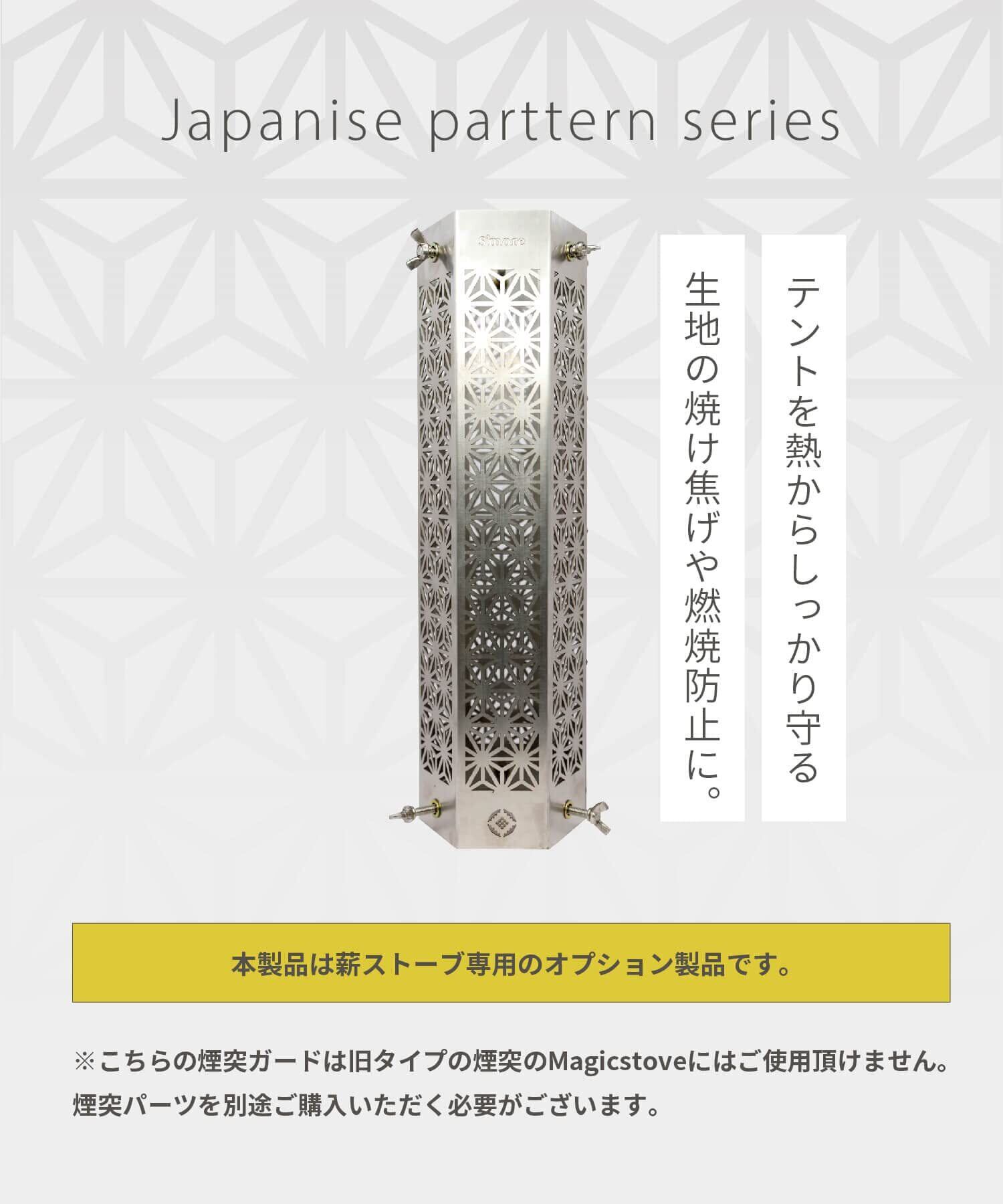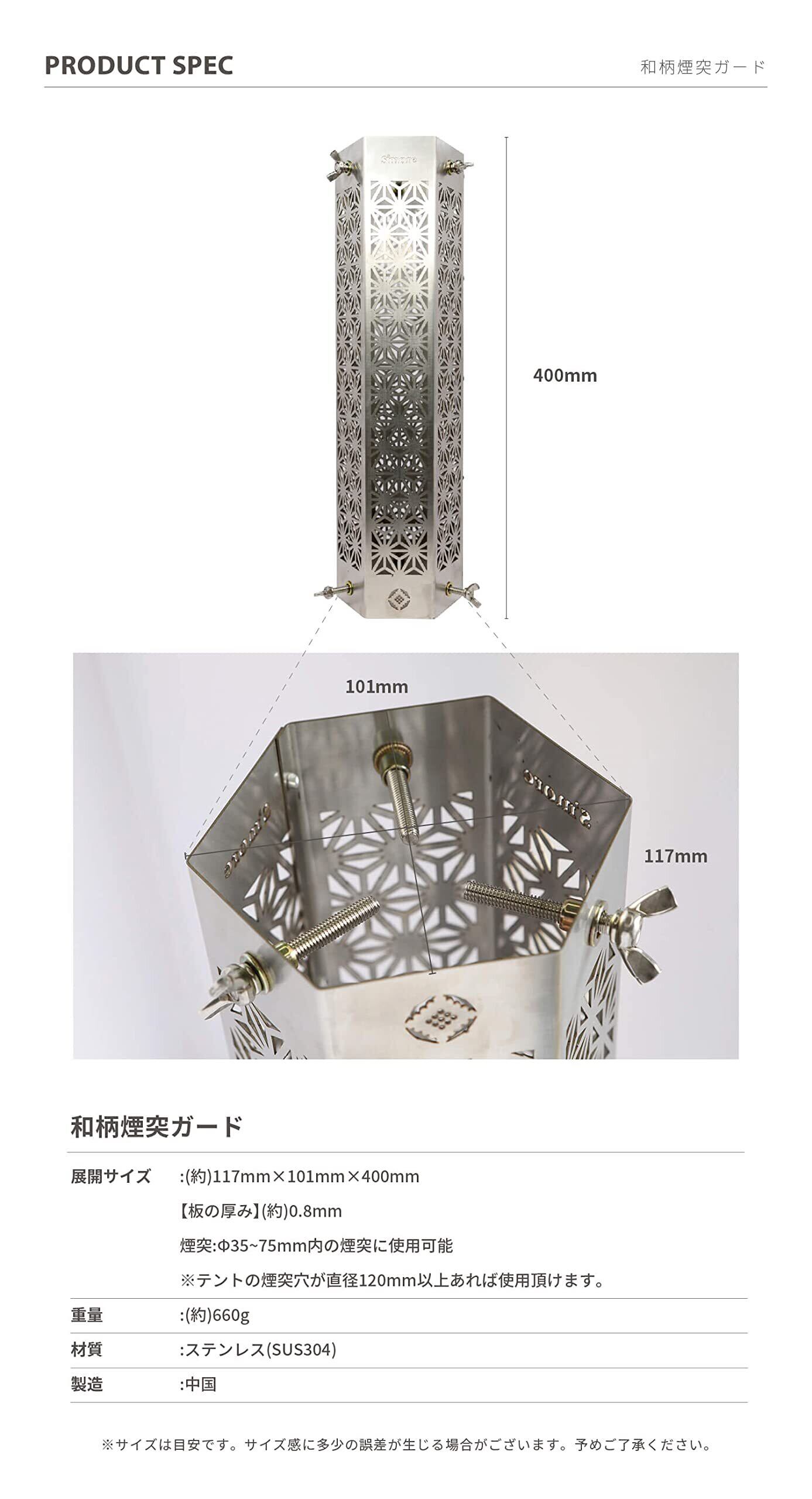 【デザインと機能を備えた麻の葉デザイン】 煙突ガード部分には伝統的な麻の葉柄を使用しています。 煙突ガードでありながらもテントの細部まで美しく見せてくれる個性的なデザインになっています。 同時に穴の面積を多く空けることによって熱を素早く輩出し、放熱も早くなるように設計されています。