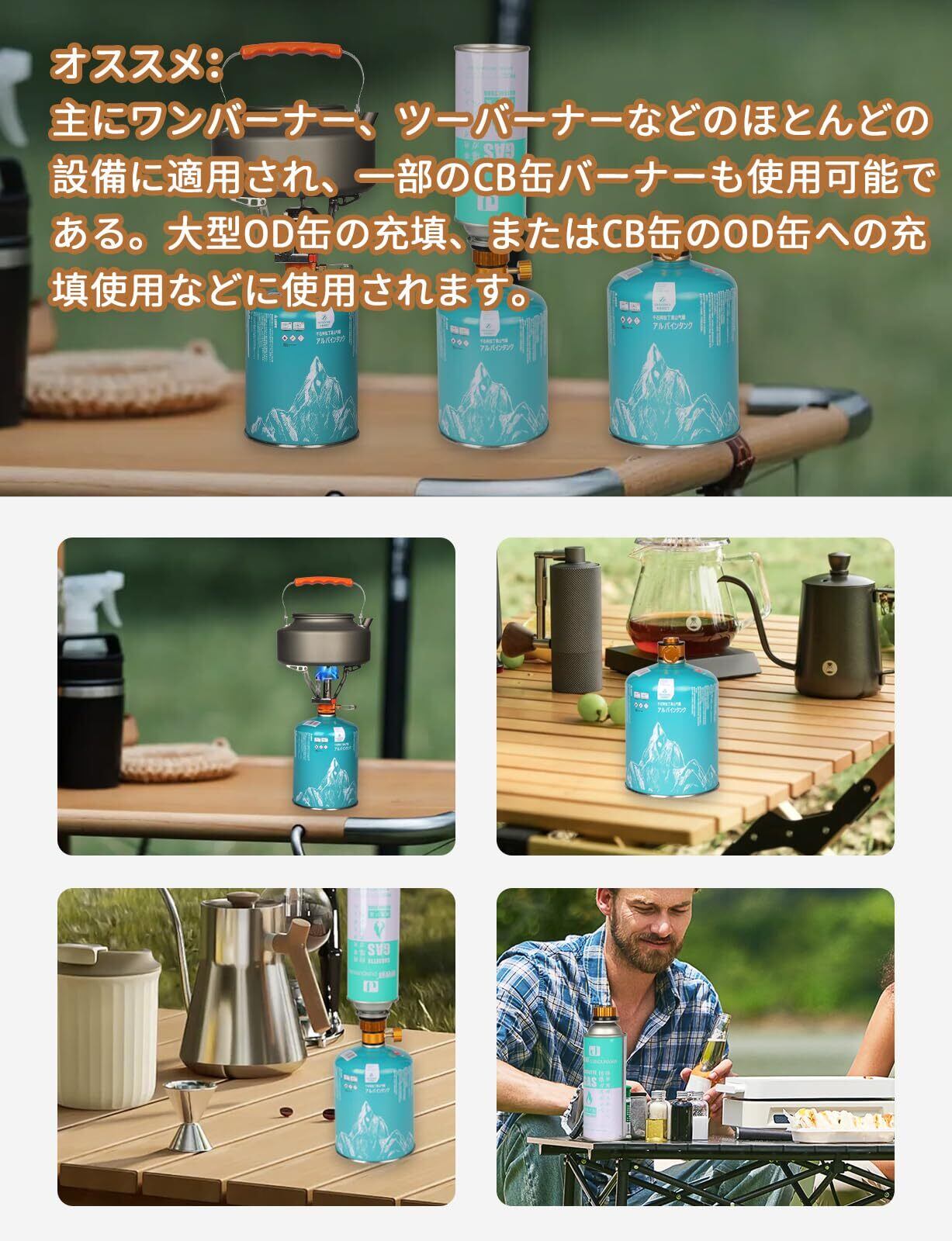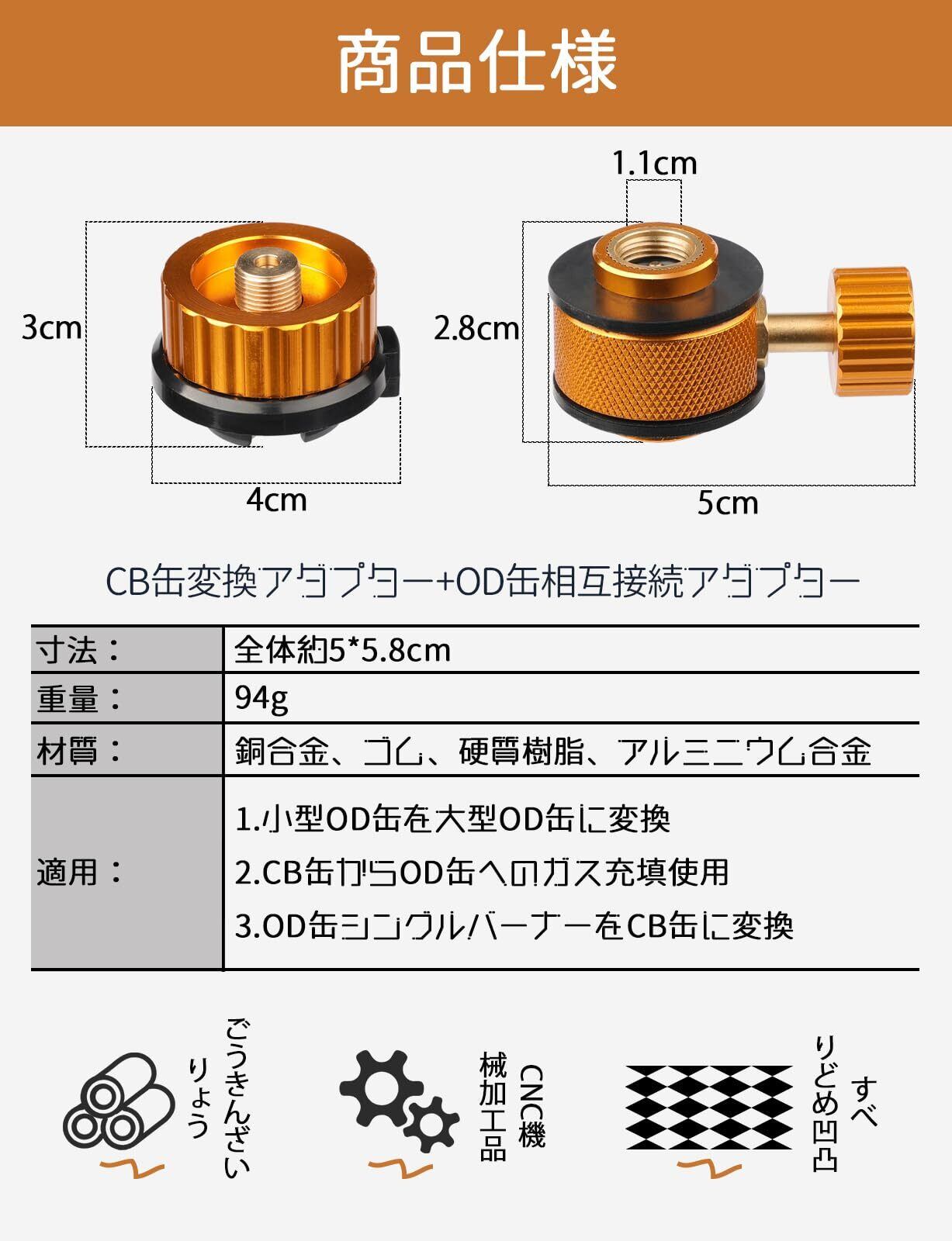 【高品質な素材】本製品は、耐久性と信頼性を兼ね備えた高品質の銅合金、ゴム、硬質樹脂、アルミニウム合金を使用しています。これらの素材は高い耐久性と耐熱性を持ち、長期間の使用にも耐える設計となっています。付属品として、OD缶相互接続アダプターとCB缶用アダプターがセットになっており、すぐに使用を開始することができます。