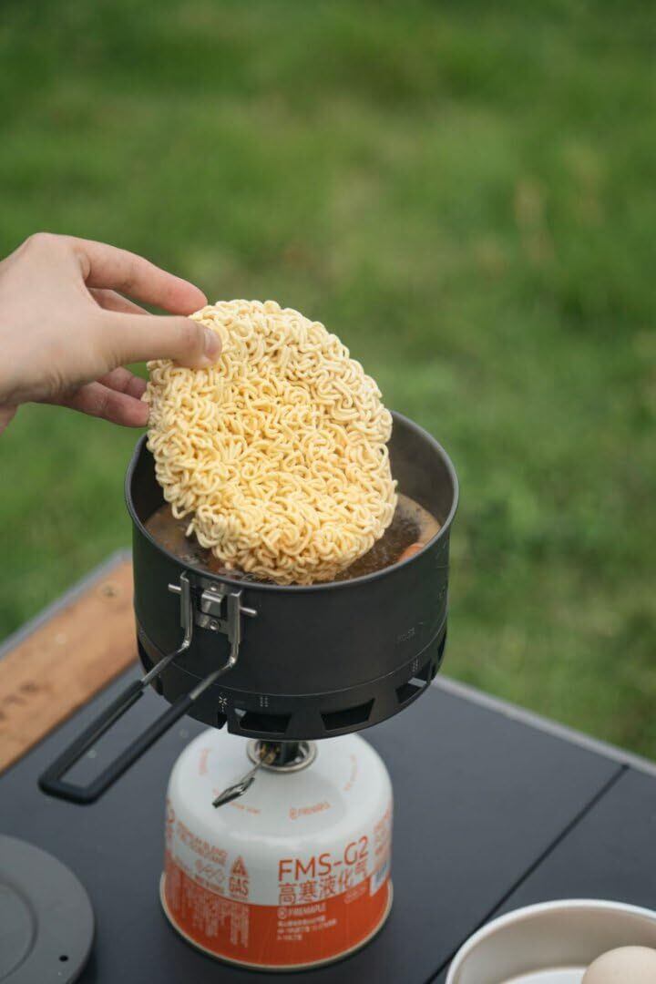 【ラーメンクッカー】キャンプ鍋は800mlの大容量で、広口デザインによりインスタントラーメンがしっかり収まります。内側と外側の両方に目盛りが付いているので、水量の確認が簡単。蓋付きで排気穴もあり、お湯沸かしから麺料理、スープ作りまで、これで多彩なアウトドア料理を楽しめます。