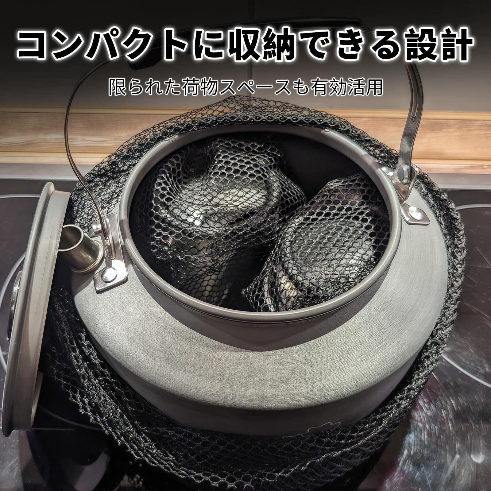 【コンパクト収納設計|マグカップなど小物もすっきり収納】ケトル内部にマグやスティックコーヒー、ティーバッグなどを入れてひとまとめに収納可能。付属のメッシュ収納袋に入れればバックパックにも収まりやすく、荷物を減らしたい方にぴったりです。