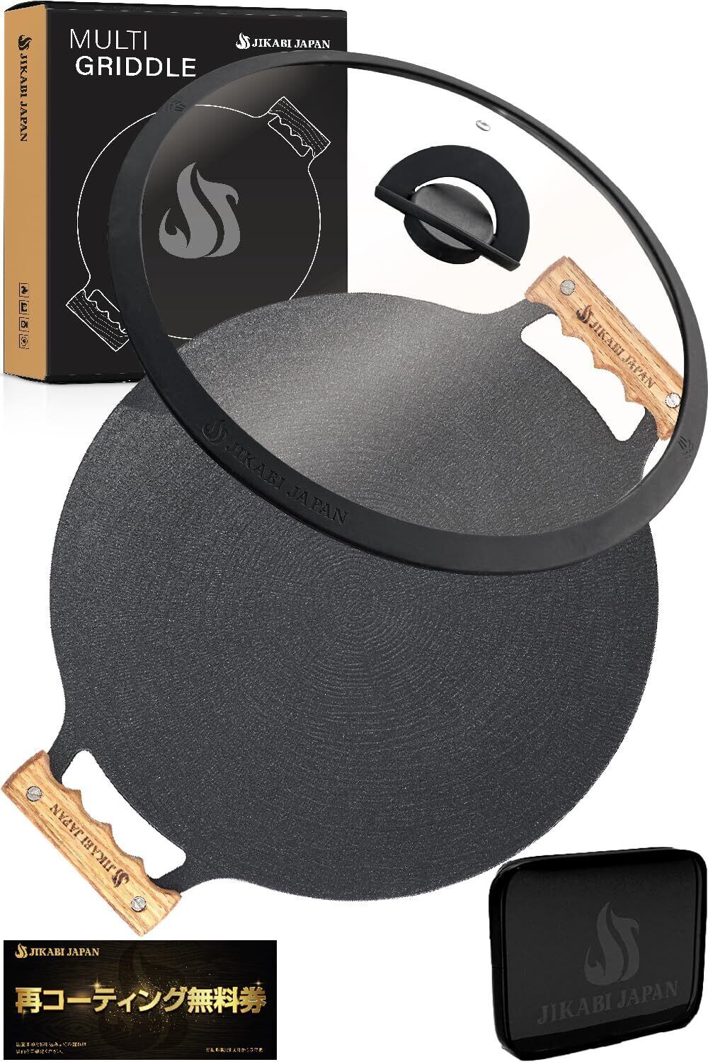 【 JIKABI JAPAN マルチグリドル 】独自の高級コーティング技術による圧倒的な焦げ付きにくさと耐久性が特徴のJIKABI JAPANが誇るマルチグリドル。直火からIHまで全熱源に対応し、これ一つで[焼く/煮る/炒める/揚げる]様々な調理が行えます。マルチグリル本体の裏面、付属の木製グリップ、付属のオリジナルPVCバッグにはブランドロゴが刻印・印字されており、日本の技術力を駆使して設計されたデザインは、機能性と美しさを兼ね備えています。