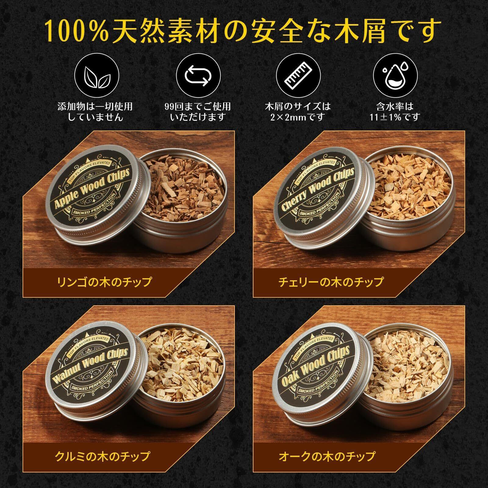 4種の天然ウッドチップ & 火力調整可能な多機能トーチ付き:キットには、風味の異なる4種の木材(オーク、ヒッコリー、チェリー、アップル)のスモークチップを同梱。燻製チップウイスキーや料理との相性も抜群で、自分好みの組み合わせを自由に試せます。チップは12±1%の水分量にまで乾燥され、2×3mmサイズに均一粉砕されているため、着火性が高く、燃焼効率にも優れています。さらに、スタイリッシュな亜鉛合金製のトーチは2段階の炎モードを搭載し、火力を自在に調整可能。スモークウイスキーセットとしても人気があり、長押しで持続点火も可能なため、操作も簡単。外観の美しさだけでなく、握りやすさと実用性にもこだわったデザインです。(※ブタンガスは別売)