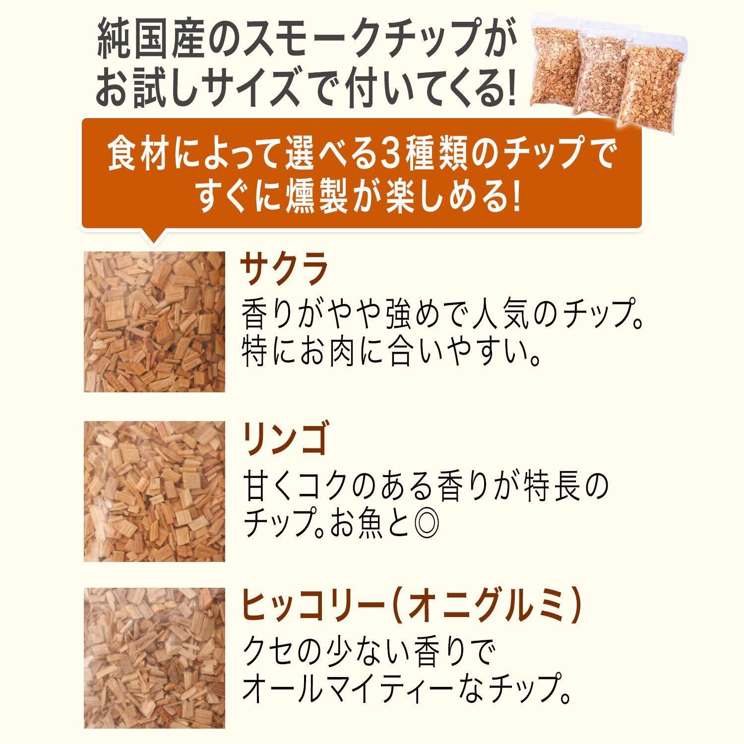 純国産スモークチップが3種類付属。すぐに燻製を楽しめます!