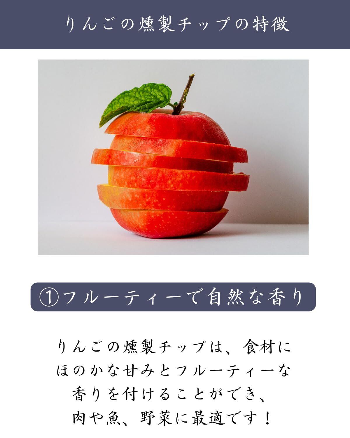 【フルーティーで自然な香り】 りんごの燻製チップは、食材にほのかな甘みとフルーティーな香りを付けることができ、肉や魚、野菜に最適です!