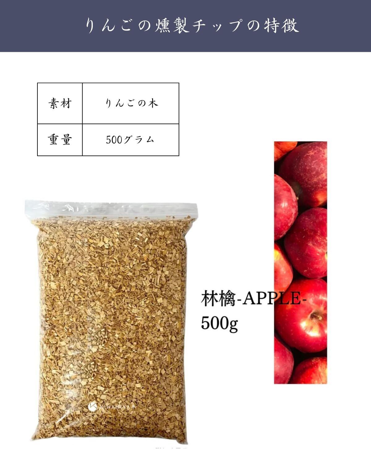 こだわりのりんごの木を使用した燻製チップ。 爽やかでほのかに甘い香りが特徴で、肉・魚・チーズ・ナッツ・野菜など、幅広い食材に優しく馴染みます。 燻製の風味をより繊細に仕上げたい方におすすめです。