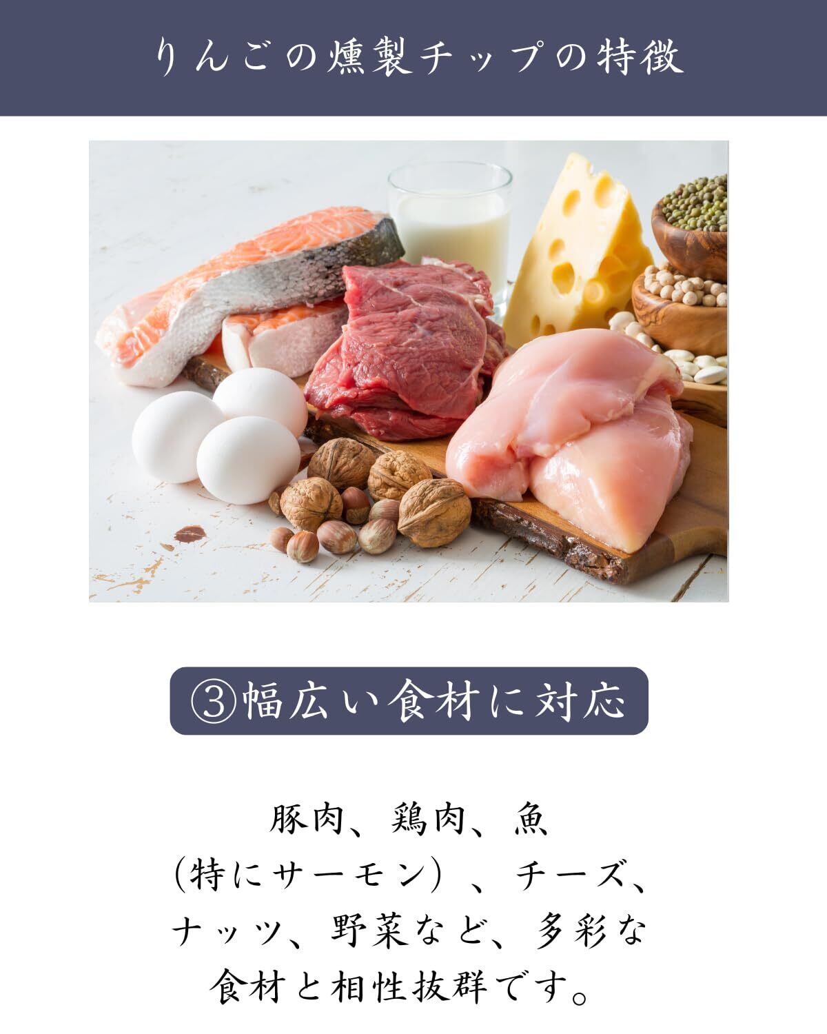 【幅広い食材に対応】豚肉、鶏肉、魚(特にサーモン)、チーズ、ナッツ、野菜など、多彩な食材と相性抜群です。