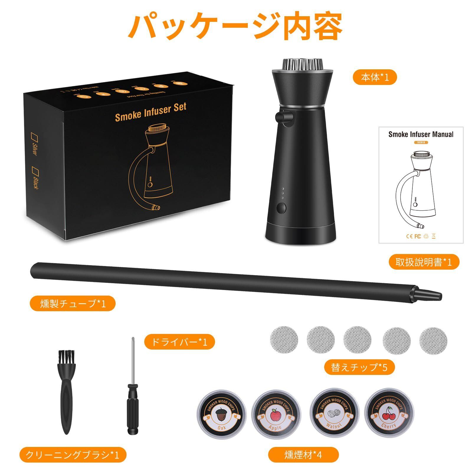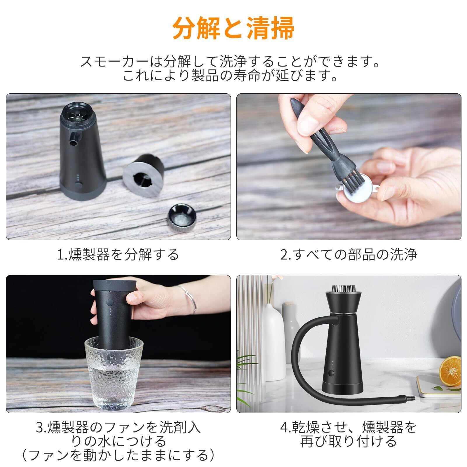 【新しい調理法】このパッケージには、本体、4種類の木材チップ、5つのフィルター、燻製チューブ、クリーニングブラシとドライバーが含まれています。スモーク器にはステンレス網状フィルター室が付き、直接に取り出す可能、専用清潔ブラシを付け加えて送り、清潔しにくい悩むから離れる。スモークチップの投入時や火の点火の際、格段に作業しやすくなりました。