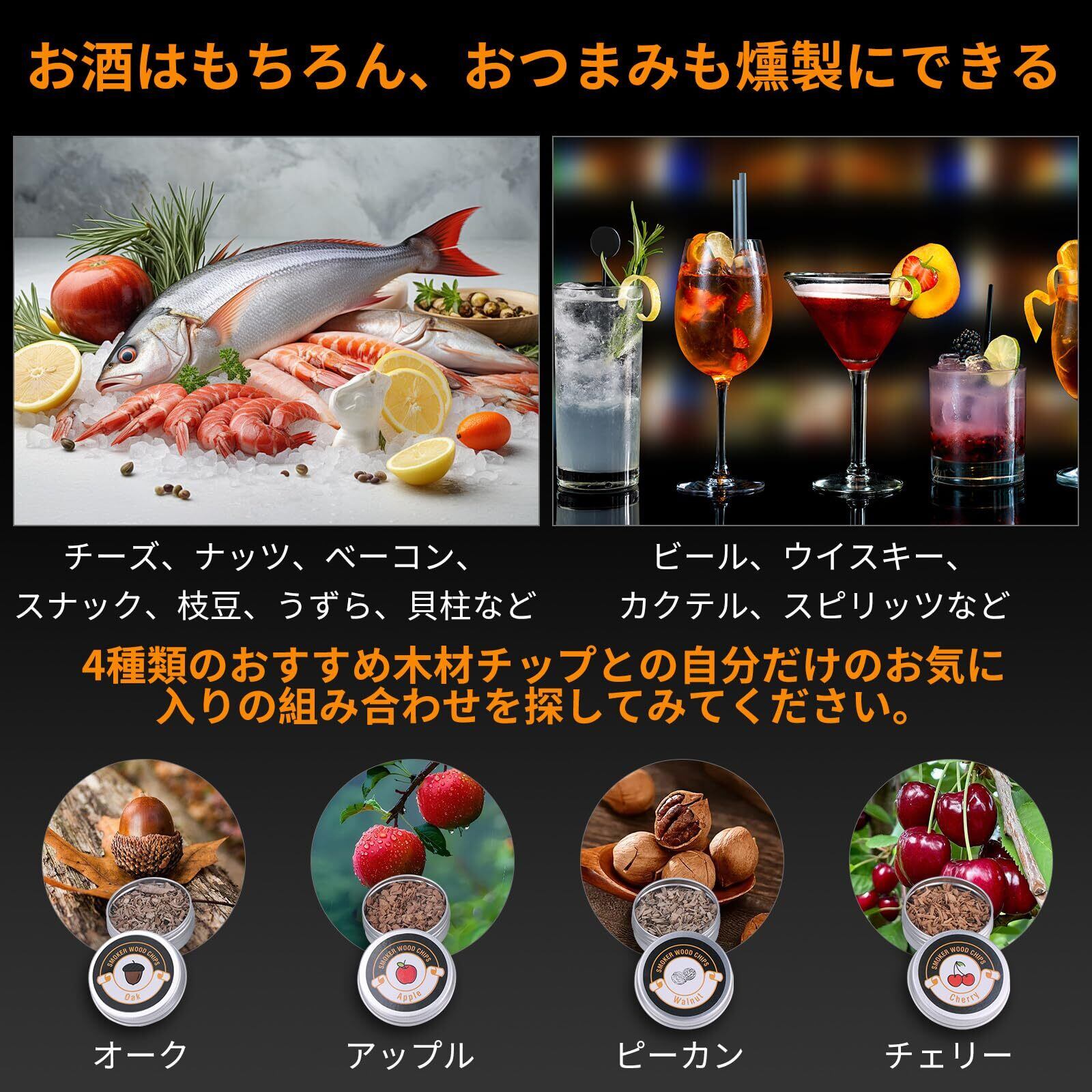 【4種のスモークチップ&いろんな食材を燻製できる】アップル、チェリー、オーク、ピーカン、4種類の化学薬品不使用天然ウッドチップで、スモーキー&フルーティな香りと味を。お手軽に本格的な燻製の香りを食材につけることができます。ひと手間で、いつもの食材をちょっと贅沢に香りづけします。お肉やお魚、チーズなどはもちろん、サラダなどの熱に弱いものもOK。また、煮たまご、サラミ、アーモンド、ス-プ、レーズンバター、アイスクリーム等にも。食材や燻製時間により、香りの強さが変わりますので、お好みで調整して下さい。