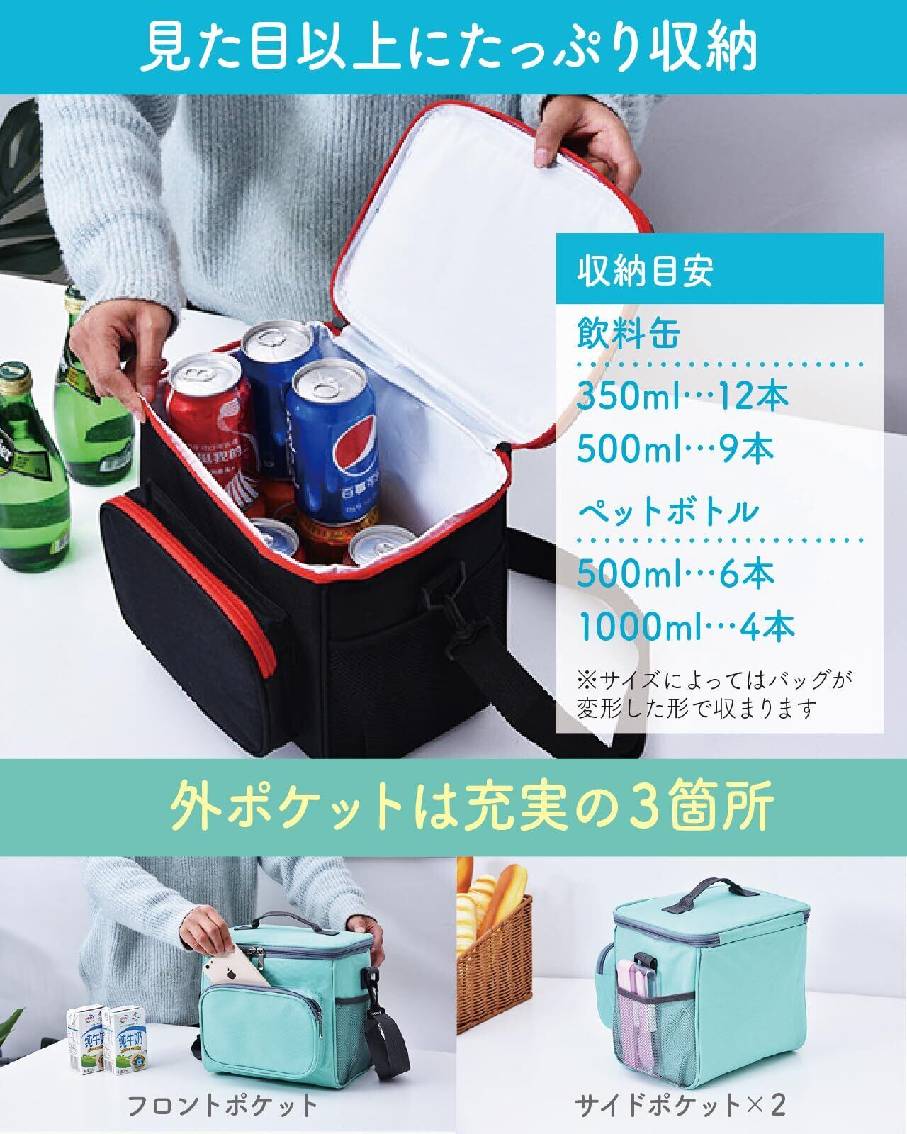 【コンパクトでたっぷり収納】 持ち運びにぴったりな10Lサイズのソフトクーラーバッグです。 折りたたみ収納も出来るコンパクト設計ですが、飲料缶なら350mlが12本、500mlなら9本、ペットボトルだと500mlが6本、1000mlなら4本入る安心の収納力があります。