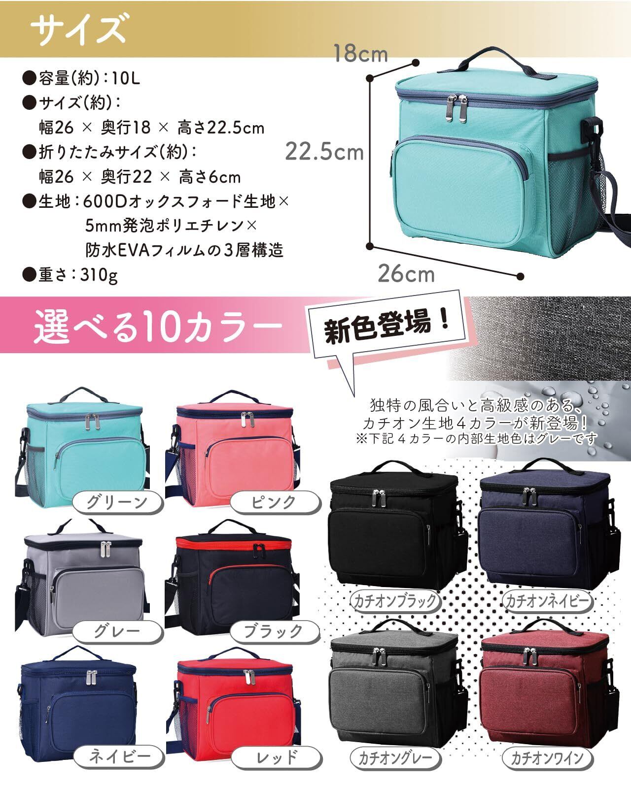 【商品規格】 容量(約):10L サイズ(約):幅26 × 奥行18 × 高さ22.5cm 折りたたみサイズ(約):幅26 × 奥行22 × 高さ6cm 生地:600Dオックスフォード生地×5mm発泡ポリエチレン×防水EVAフィルムの3層構造 重さ:310g