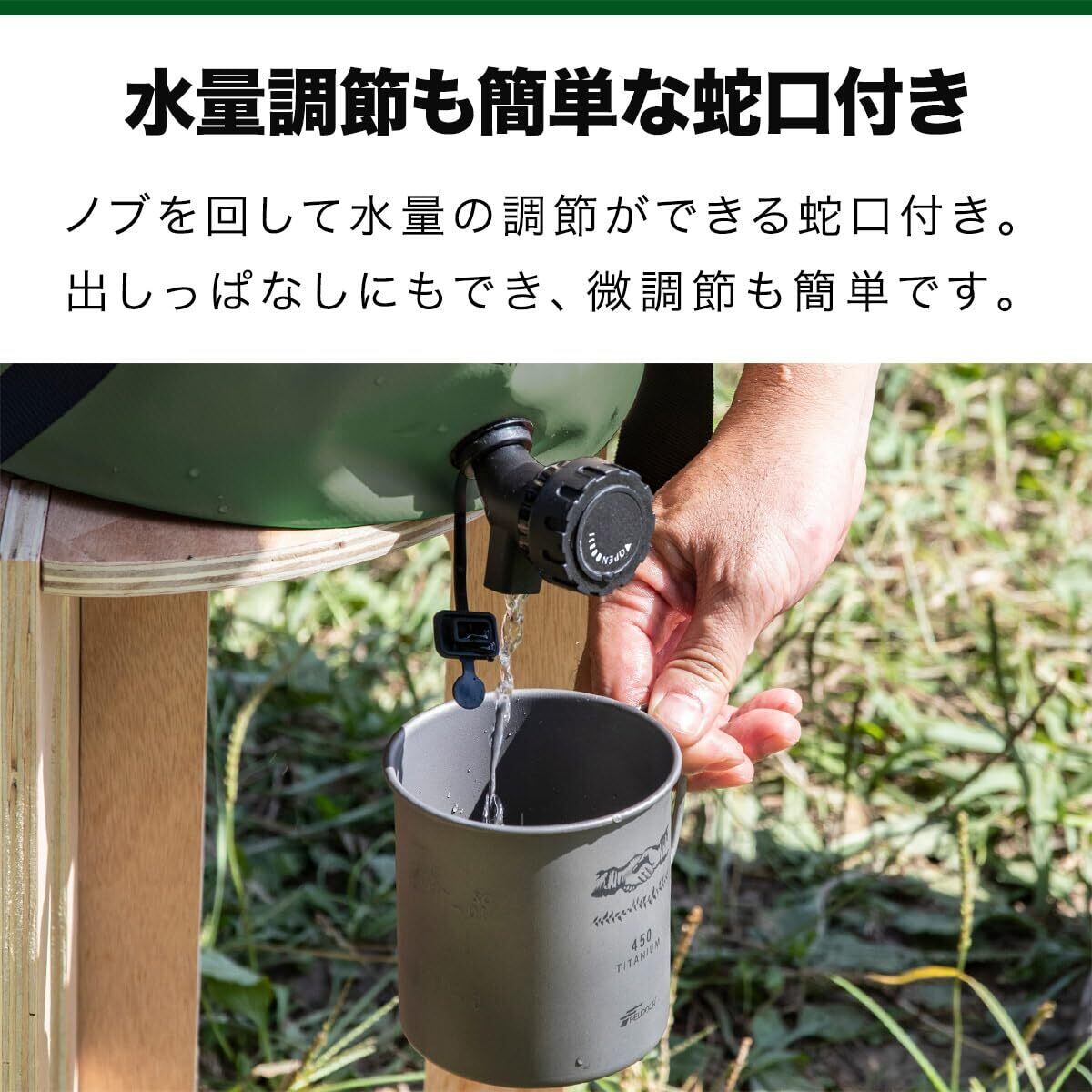 【ソフトタイプのウォータージャグ】手洗い、食器のすすぎ、料理作りなど、多用途に使えるウォータージャグは、水場への往復を省き、また、ソフトな素材でコンパクトに収納できます。【1泊分にちょうどいい10L】こちらのジャグの容量は約10Lで、ファミリーやグループキャンプなど、大人4人で1泊するのにちょうどいいサイズ感です。【水量調節も簡単な蛇口付き】ノブを回して水量の調節ができる蛇口付き。出しっぱなしにもでき、その間は両手を使えるので便利です。水量の微調節も簡単です。