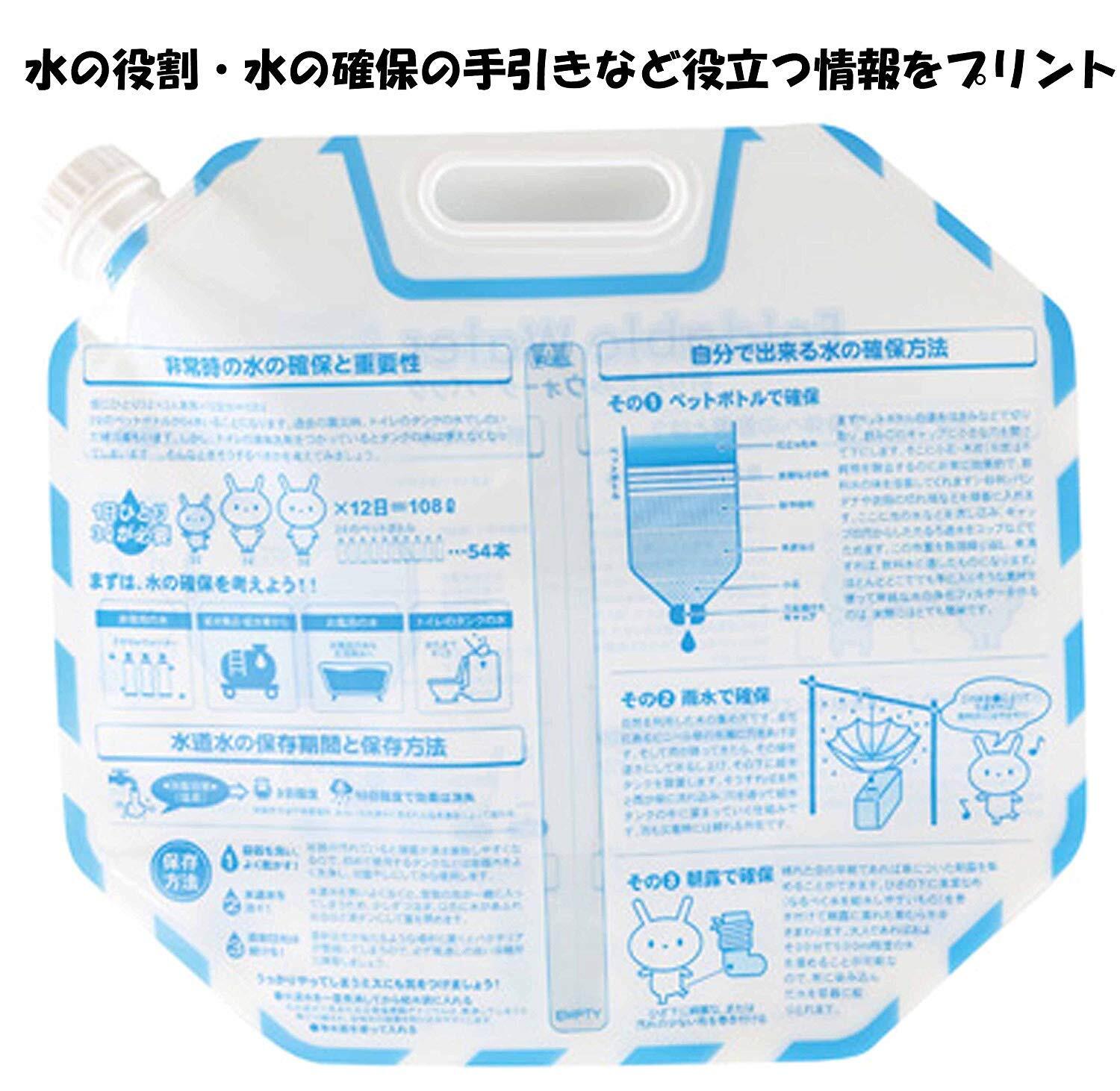 仕様:外側には非常時の水の役割や確保の仕方等の情報をプリント。災害時の断水時など飲料水から、携帯トイレなどに重宝する必需品です。