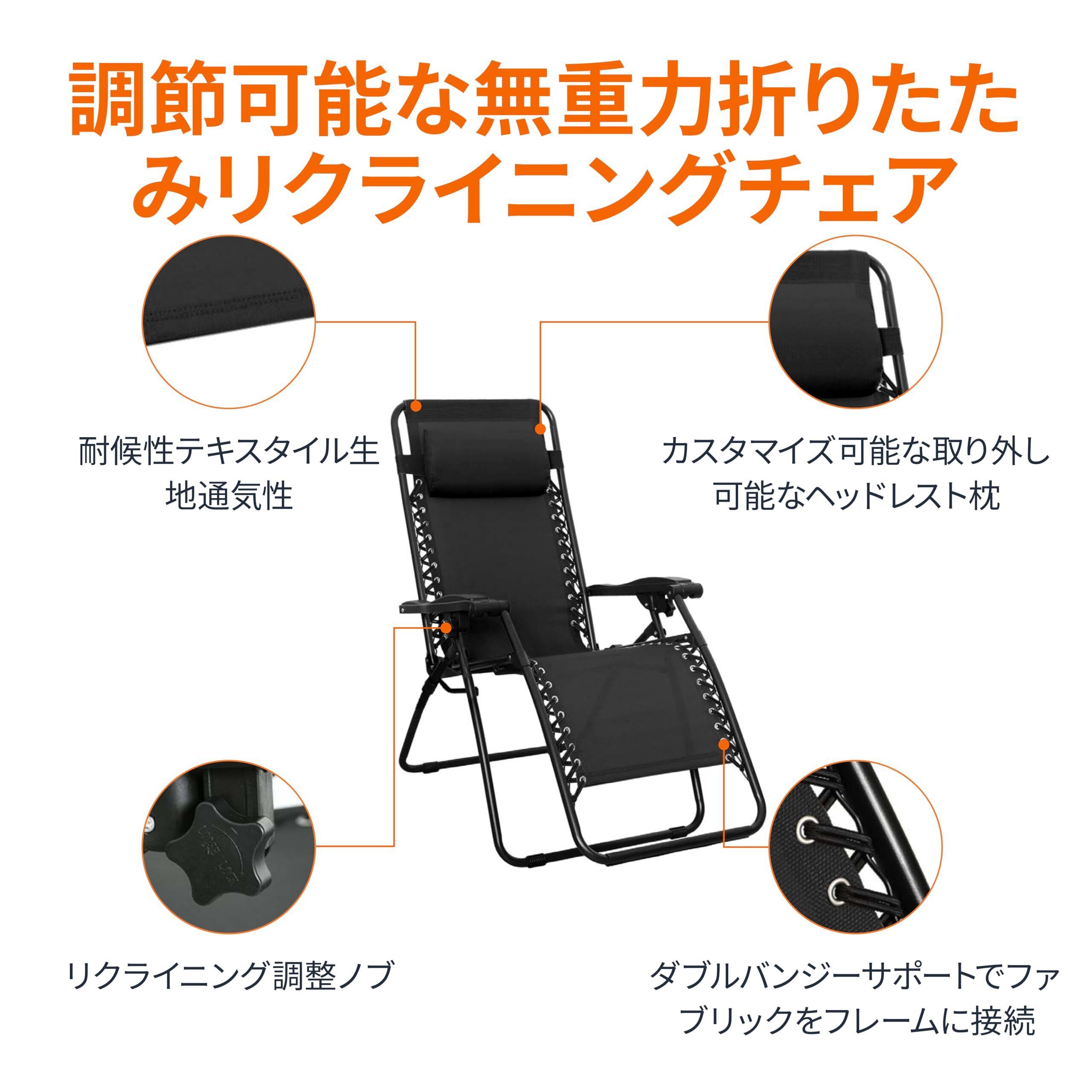 ベーシック 椅子 キャンプ アウトドアチェア 折りたたみ ゼログラビティーチェア 幅66cm x 奥行90-165cm x 高さ75-110cm ブラック