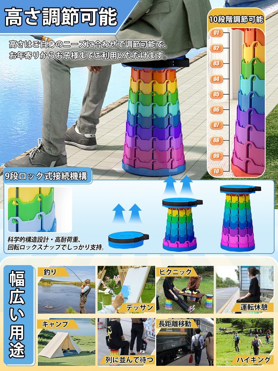 【高い耐荷重能力】わずか935gの軽さにもかかわらず、当社の伸縮式アウトドアチェアは最大200kgの重量に耐えることができます。これは、頑丈なABSとポリアミド素材を使用し、9つの高さ調整と固定デザインを採用したためです。その結果、非常に安定性が高いです。(商品の重量は約935gですが、各製品の実測重量には多少の誤差が生じます。)