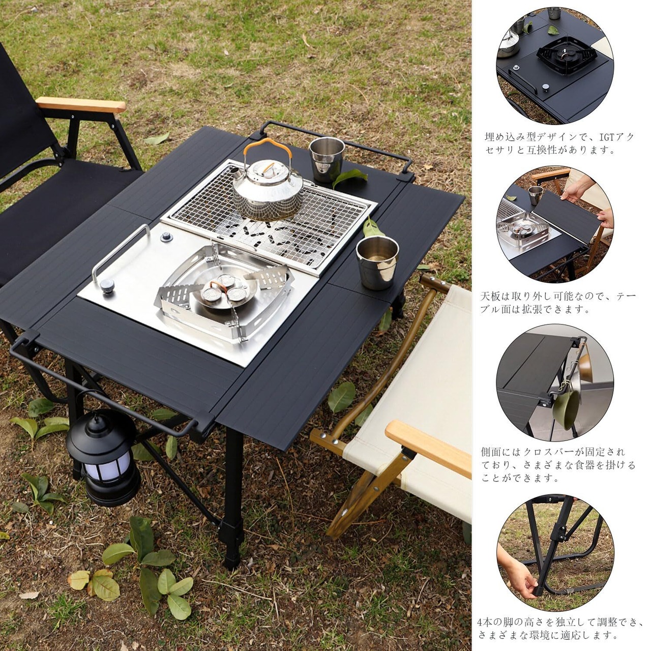 【自由に組み合わせるIGTキャンプテーブル】こちらのキャンプテーブルには6枚のIGT天板が付属し、フラットバーナーなどインストール可能です。室内からレジャーまで、様々なシーンに応じて自由に組立・分解ができます。キャンプだけでなく、おうちのリビングやベランダ、庭でも使用でき、ハイキング、ピクニック、運動会などアウトドアでも大活躍。