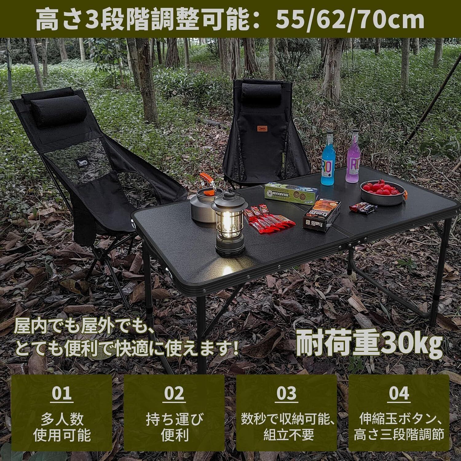 ■【実用的で便利なキャンプテーブル!】このキャンプテーブルは、120cmの広々とした天板を持ち、ピクニックやキャンプでの食事を快適にします。高さは3段階に調整可能で、様々なシーンに合わせてご使用いただけます。