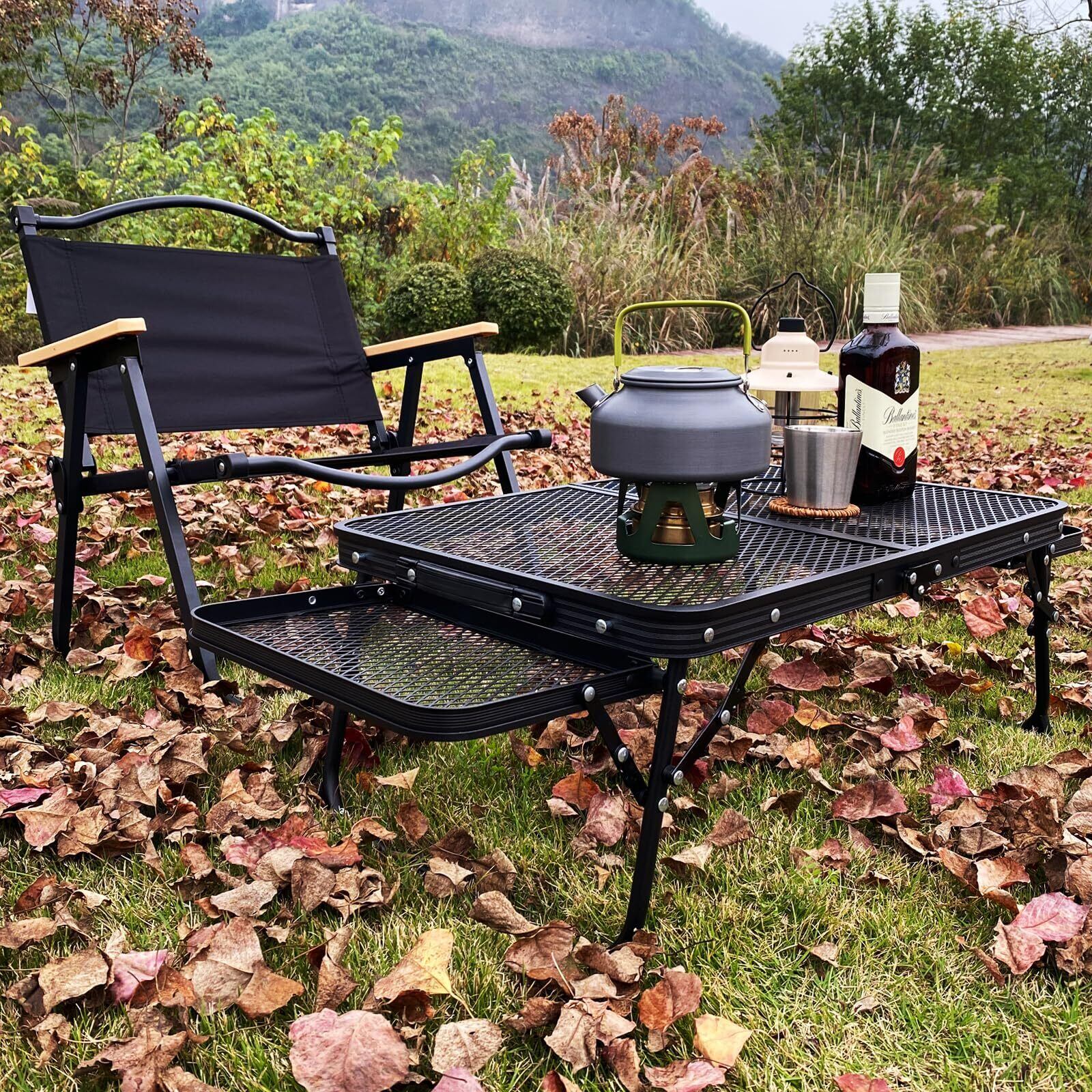 【在庫限り】推薦する2025年新 折りたたみテーブル アウトドア折りたたみ式ミニキャンプメッシュ屋外ポータブル木目メッシュ収納ミニ軽量焚き火台耐熱ローテーブル板付き金属素材レジャーテーブル (W-2)