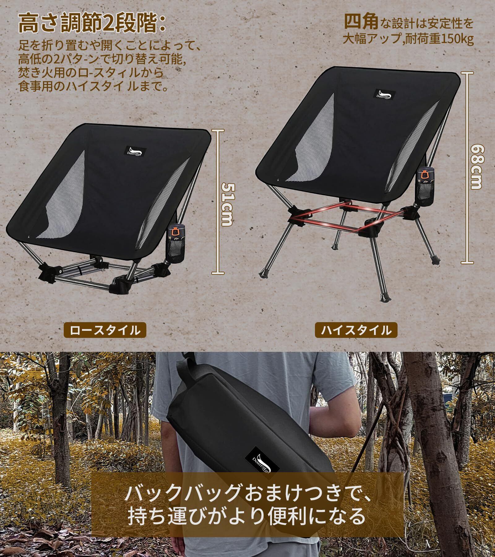 DesertFox キャンプ椅子 アウトドア チェア 2WAY 高さ調節可能 ローチェア 軽量 【独自開発のカップホルダー】 耐荷重150kg コンパクト イス ロータイプ いす 収納袋付属 携帯便利 ST