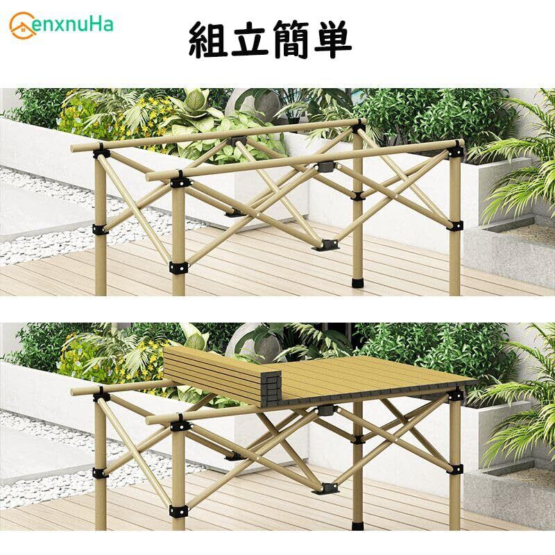 【組立簡単】キャンプテーブル椅子セットの取り付けはとても簡単で、さっさとキャンプテーブルのセッティングを終わせる。天板部分は長方形のアルミ板複数枚を取り付けることによって強度が生み出されるつくりとなっています。バーベキューやキャンピングカー旅行、アウトドアでの食事に最適です。