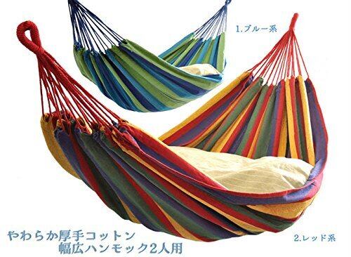 ハンモックは使用時に大きくスペースを取りますが、 利用する時にだけ吊り下げ、使用しない場合は折り畳んで収納できますので ハンモックを購入したからといって大きく場所が占有されることはありません。 部屋が狭い都会の方も狭いスペースながらハンモックを購入して上手に空間を 有効利用できるのがハンモックの利点です。 アパートなどの貸家で、壁や柱などに金具を取り付ける事が厳しい環境の方も、 ハンモック用のスタンドを利用して楽しむ事ができます。 そんな初めてのハンモック体験に最適なハンモックとして TOCOTABIがセレクト したのは、とても柔らかい厚手の綿生地で作られた、心もわくわくするカラフルな、 このモデルです。