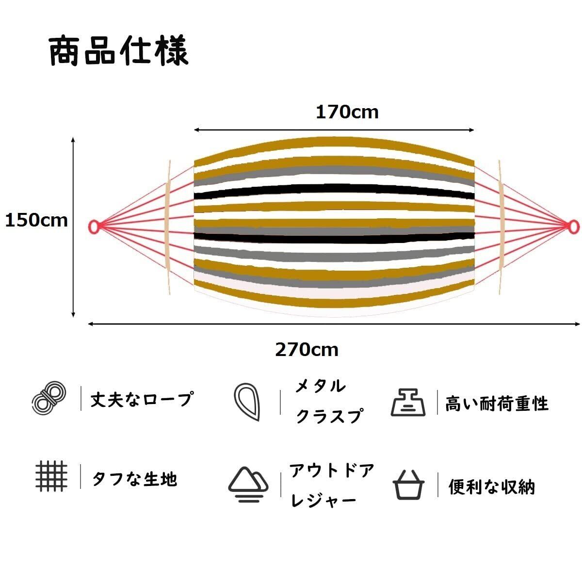 【ハンモック仕様】ハンモック生地のサイズ:約270×150cm、重さ:1.4kg、素材:コットン 収納時サイズ約32cm * 20cm * 13cm耐荷重:300kg (商品寸法について、測定方法・測定点により、2~5cmの誤差がある可能),付属品: 2*縄、1*同色の収納袋(持ち運びに便利です)。