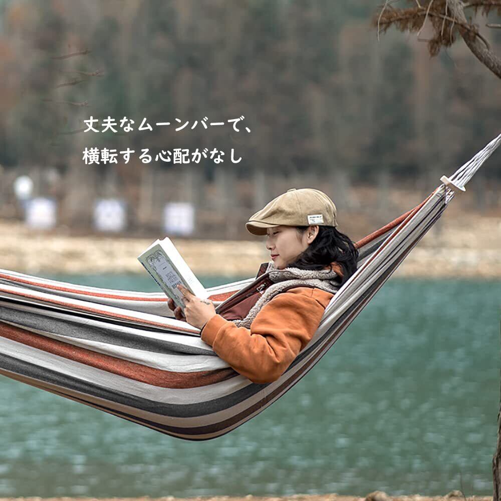 【安心的な素材】ハンモックの生地が丈夫で破れにくい、300kgまでの耐重荷全く問題なし。通気性の優れた綿素材を採用し、より良い肌触りで、キャンプやピクニックの時に寝心地が最高です。