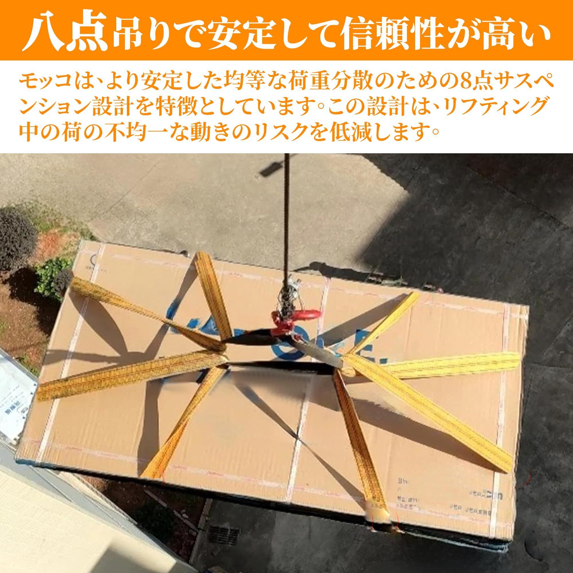 ■【高い耐荷重を実現!】シートモッコは、耐荷重2.5tを誇る八点吊りタイプの頑丈な設計です。重い荷物の運搬や、土木工事、港湾荷役など、様々な業務で安心してご使用いただけます。さらに、その強靭な素材により、長時間の使用にも耐えることができます。