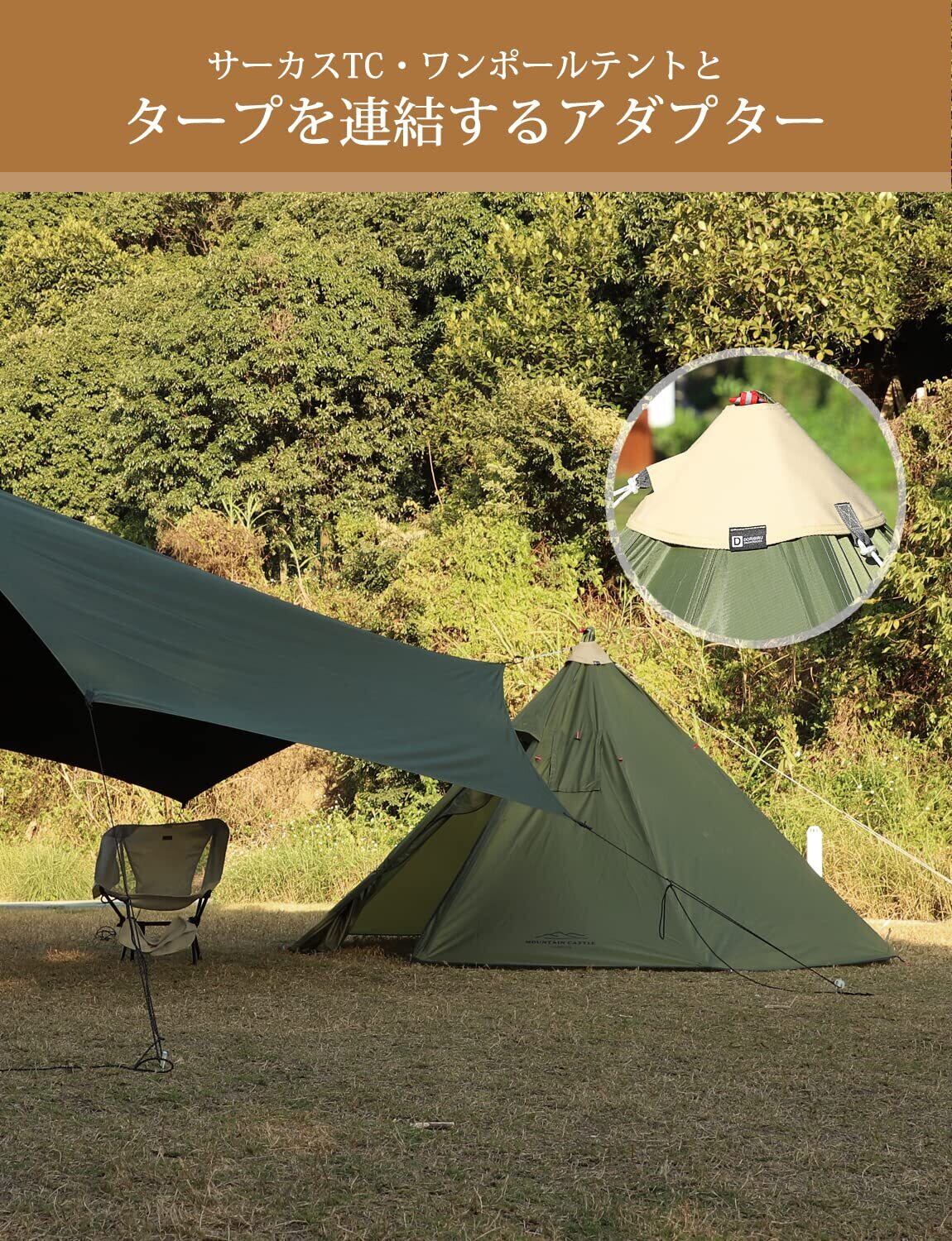 【タープ連結アダプター】サーカスTC・ワンポールテントとタープをスマートに連結するアダプターです。テントとタープを近づけて設営できるので、居住空間をさらに広げ、テントに出入りするとき雨に濡れにくく、レインアウトがコンパクトで見た目も良いし、キャンプライフがより快適になります。