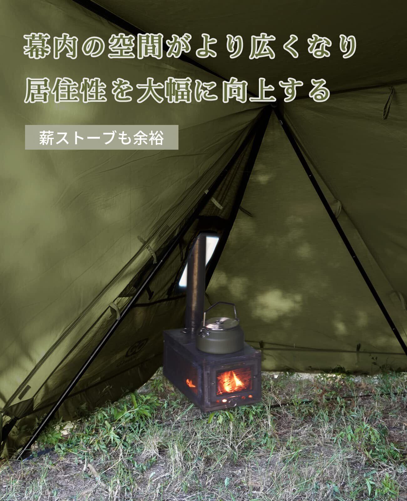 【より快適なパップテント環境を】本製品はGOGlampingパップテントの専用二又ポールです。ポールを二又にすることで、メインポール周りのデッドスペースを有効活用できるようになります。従来よりテントの空間が広がる事で、幕内の隅までテーブルやストーブなどのギアを配置頂けます。