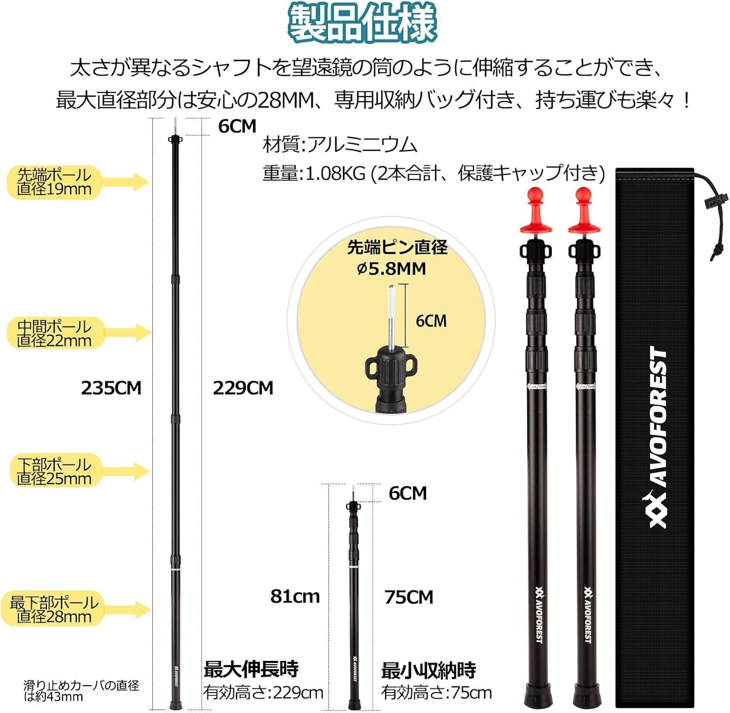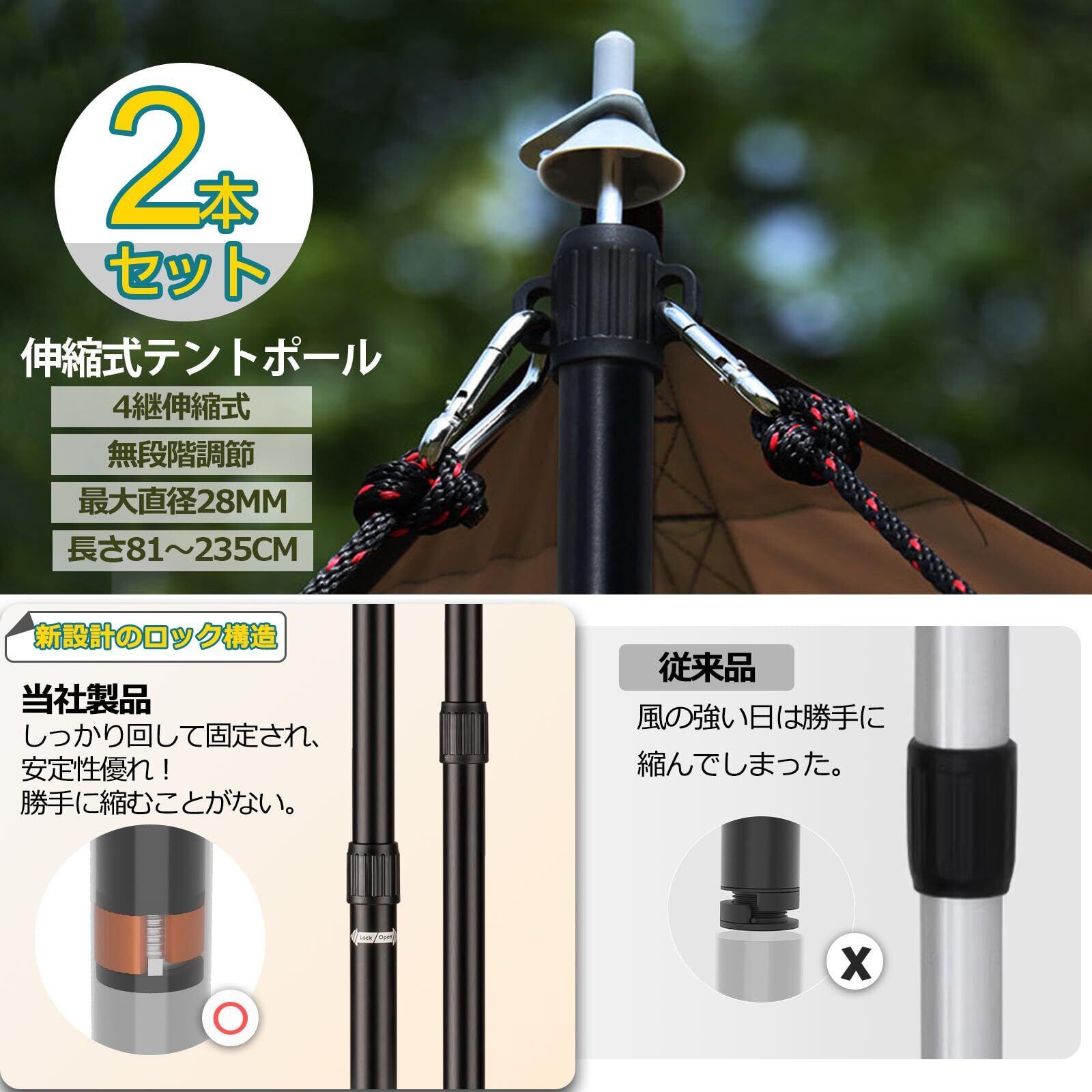 タープポール 伸縮式 【強化されたロック構造】 アルミ テントポール 直径28mm (高さ81~235cm) 4継無段階調節 2本セット エンドキャップ スライド式 高さ調節簡単 回すだけ 専用収納バッグ付き コンパクト キャンプ アウトドア 設営工具