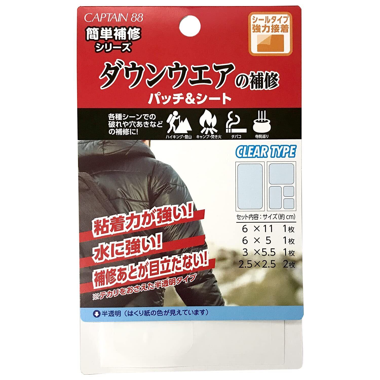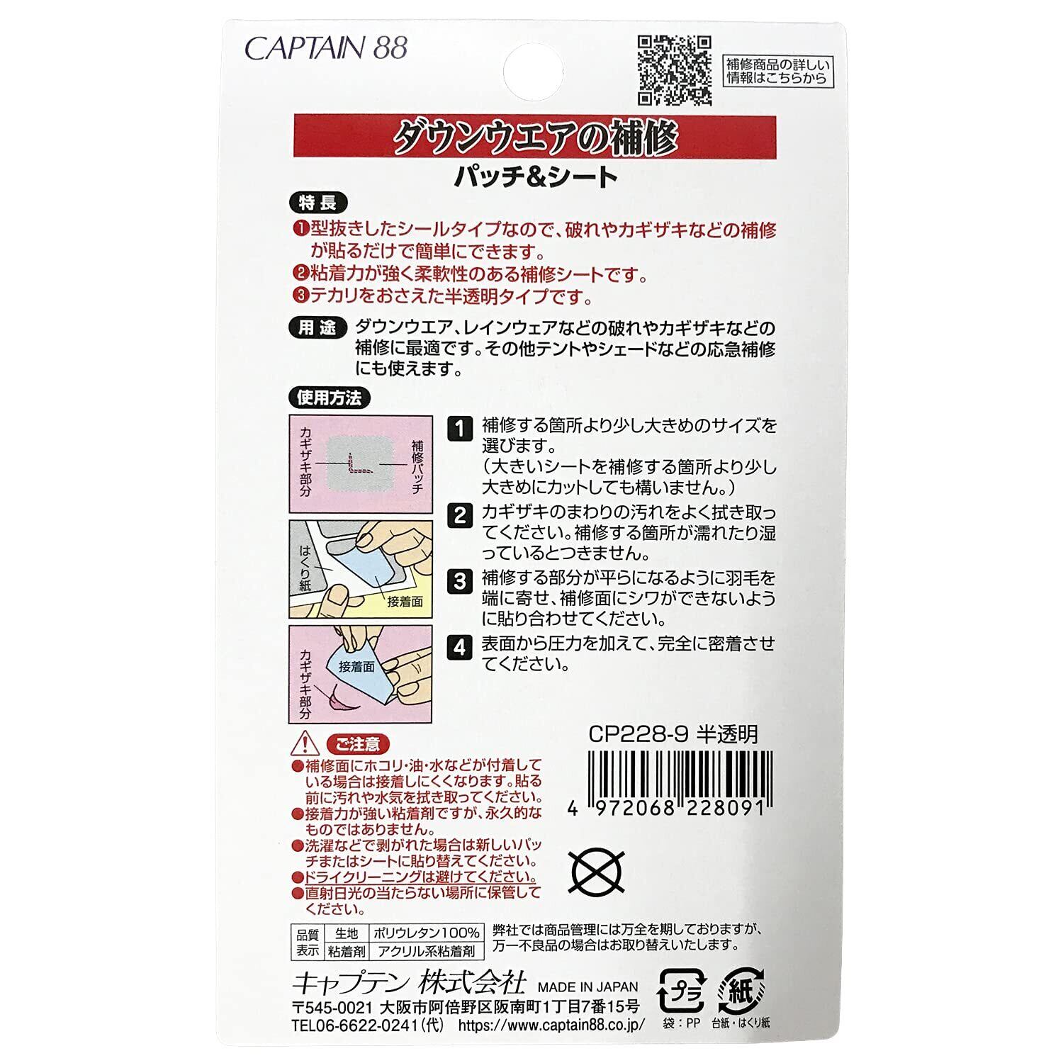 【数量限定】CAPTAIN88 キャプテン 簡単補修シリーズ ダウンウェアの補修パッチ&シート 5枚入り 4種サイズ #9 半透明 シールタイプ CP228