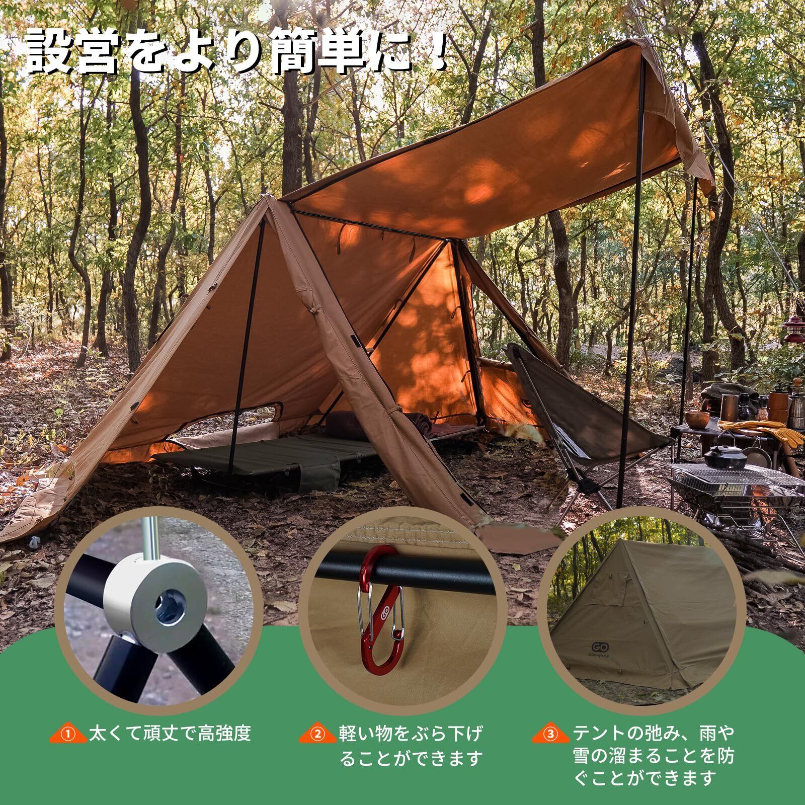 【より快適なパップテント環境を】本製品は二又ポールの天井ポールのみです。パップテントに専用です。ポールを二又にすることで、メインポール周りのデッドスペースを有効活用できるようになります。従来よりテントの空間が広がる事で、幕内の隅までテーブルやストーブなどのギアを配置頂けます。【持ち運びに便利】セット重量は約400gで、キャンプ、登山、お花見、ピクニックなどにご活用ください。