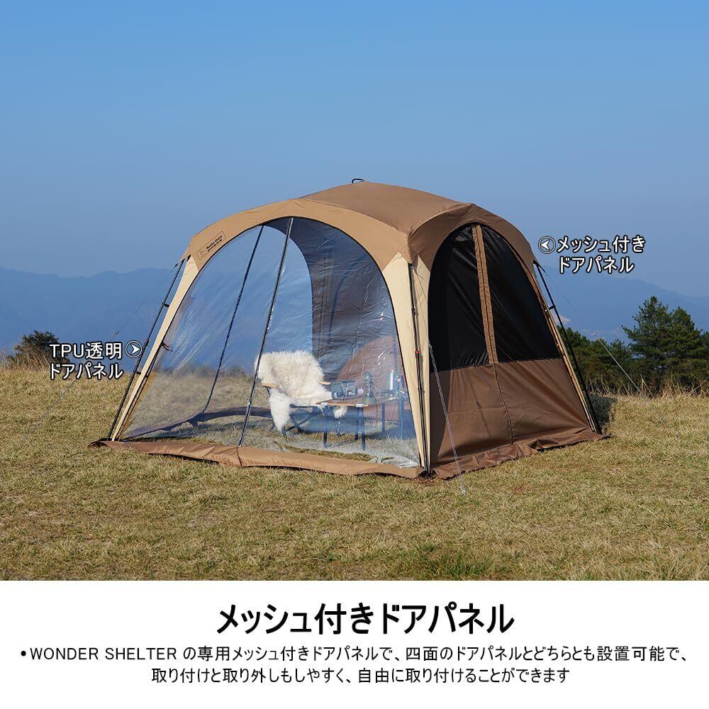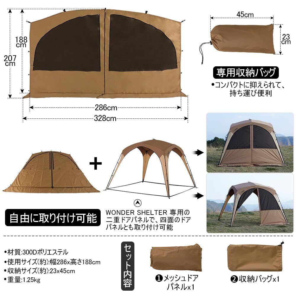 四面とも取り付け可能:WONDER SHELTER の専用メッシュ付きドアパネルで、四面のドアパネルとどちらとも設置可能で、取り付けと取り外しもしやすく、自由に取り付けることができます。