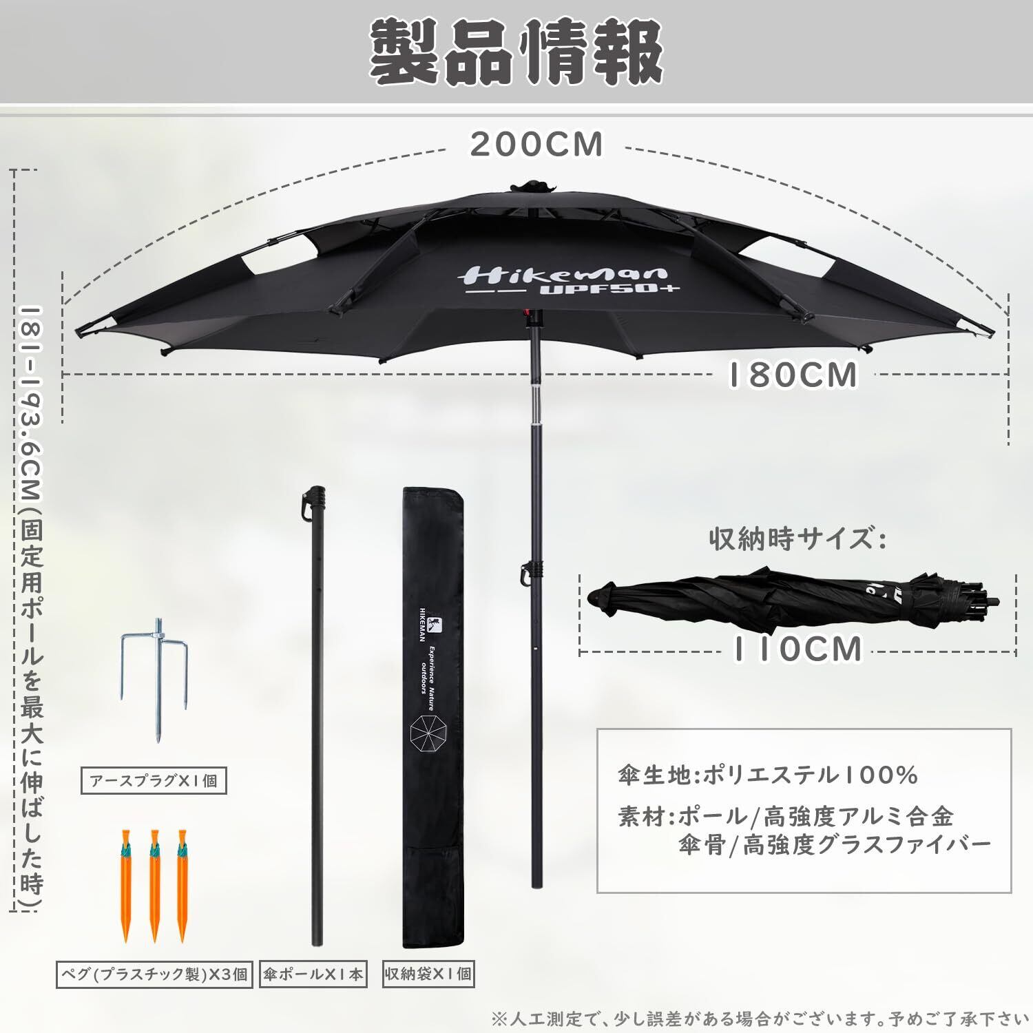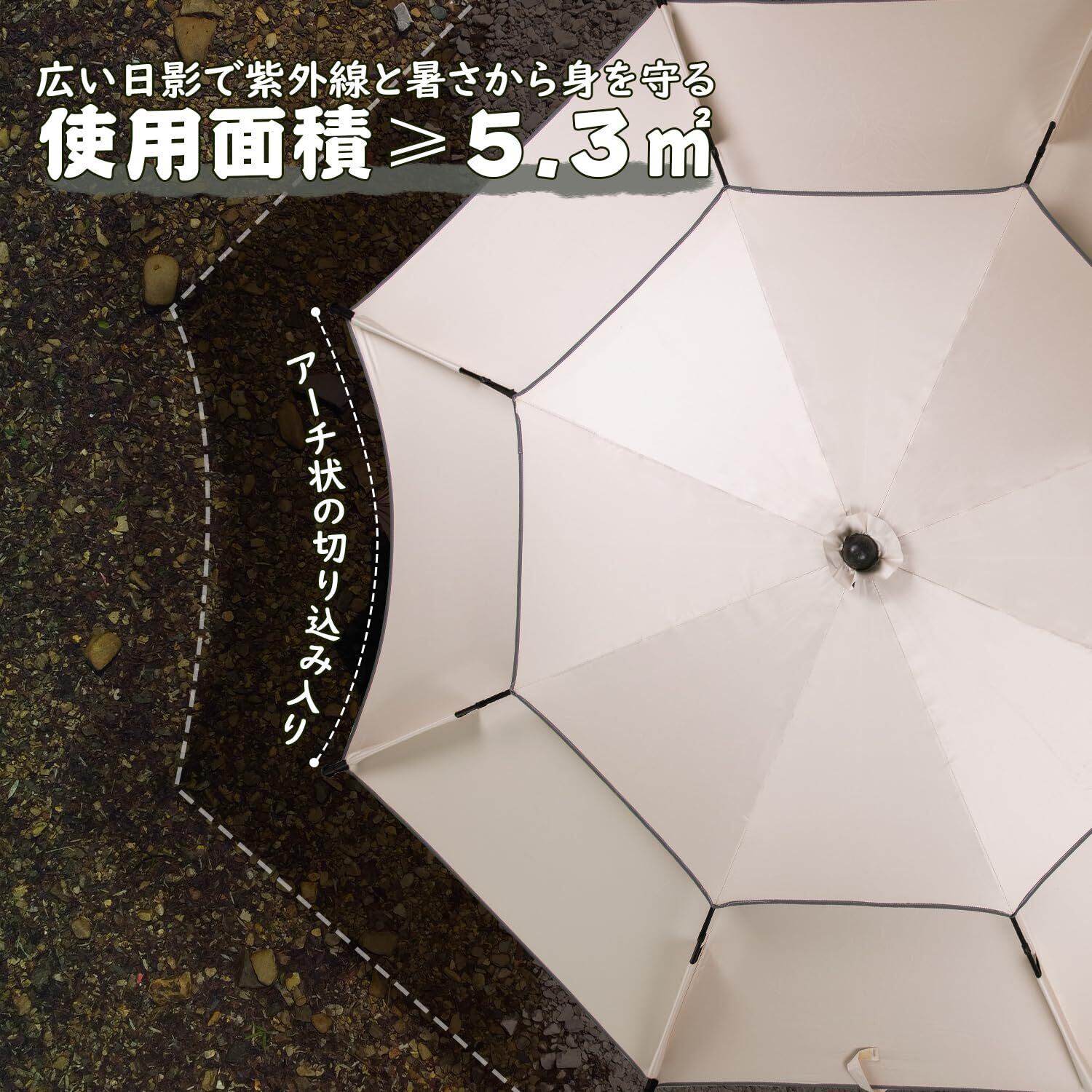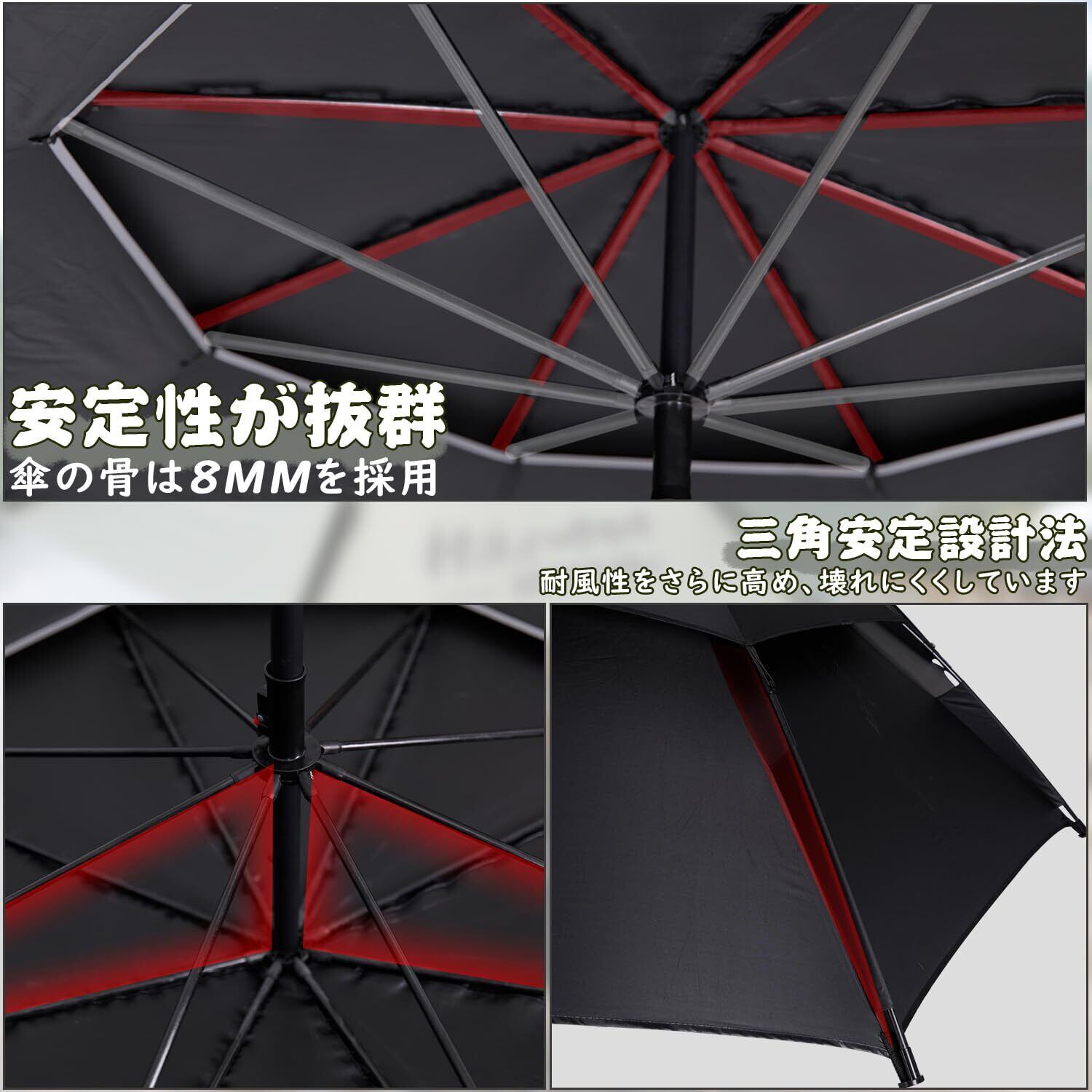 強風に強い設計:️パラソルの上部には風抜きのベンチレーションも装備、パラソル内側にたまる空気が通り抜け、通気性が抜群な一方で、突然の強風による倒れる事故も防げます。直径約8mmの傘骨に三角安定設計法を使用し、さらに風に耐えられる強度と安定性を高めました。