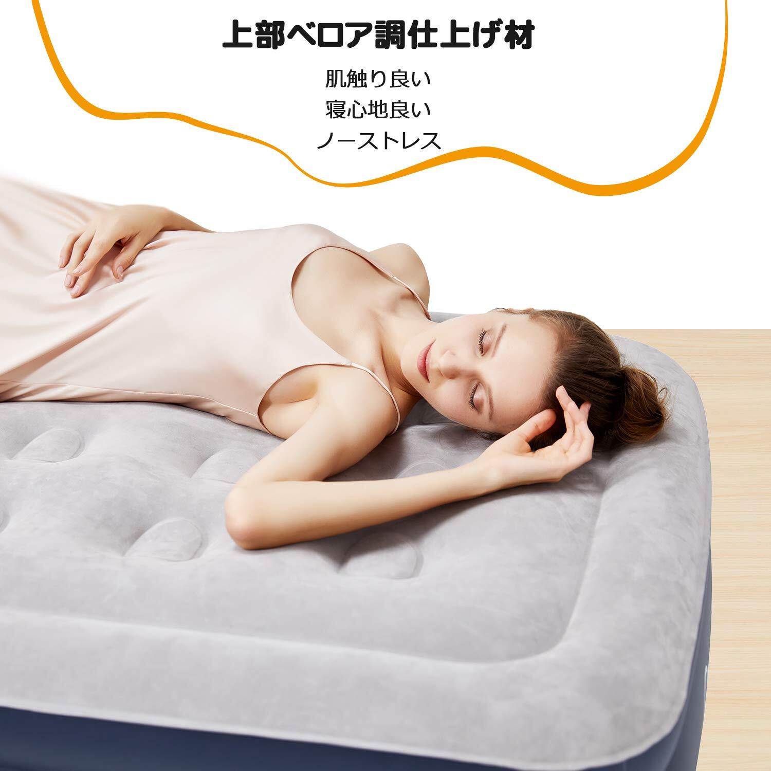 【フロック加工・肌触り抜群】ひんやりしない表面ベロア仕上げでなめらかな肌触りで、爽快な目覚めが迎えられます。ベッドの底面と側面に厚さ0.5mmのPVCとポリエステルの編地を重ねた素材を使用し、エアーマットの耐久性を高め、穴あけや形崩れを起こしにくく、長く使える!また、底面と側面は防水仕様なので、汚れも拭き取りやすく、お手入れも簡単!