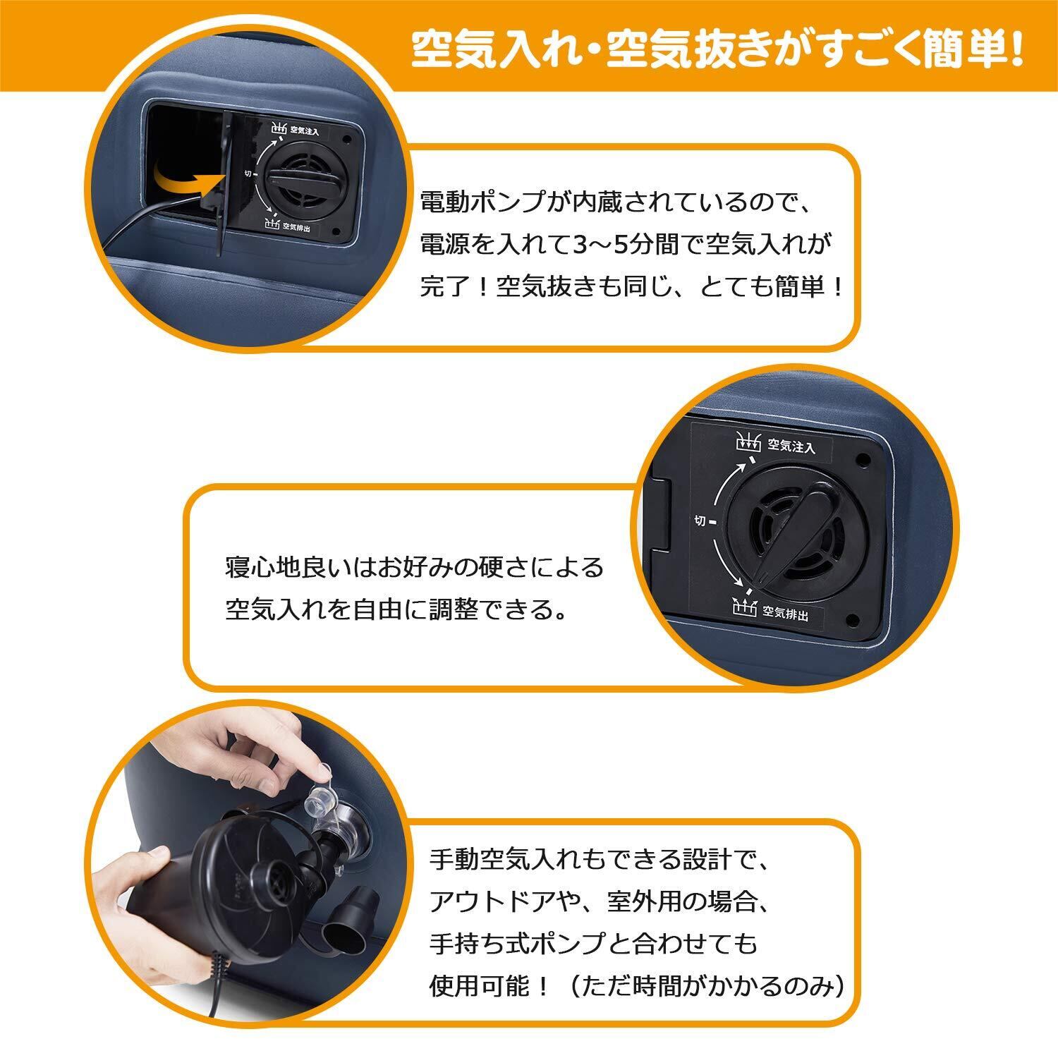 【電動ポンプ内蔵・時間を節約】電動ポンプを内蔵して、空気の出し入れ・抜くは電動なので手間いらず、3〜4分で膨らませることができます。お好みに応じて空気量を簡単に調節できます。屋外で使用する場合は、手動ポンプを使用して膨らませることもできます。※長時間使用すると自然に空気が漏れますので、2日ごとに10〜15秒の空気を入れることをお勧めします。内蔵エアポンプは100V(50 / 60Hz)のダブルホールフラットプラグを使用しています。