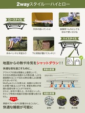 【2wayスタイル--ハイとロー】ハイコットはベンチとしても使用できるので便利ですが、天井が低いテント内で使用すると圧迫感が気になることがあります。ローコットであれば天井が低いテントでも圧迫感はありませんが、地面に近い分凹凸が気になったり、地面の冷気や熱気の影響を受けやすくなったりすることも。そんなときには、ハイコットとローコットを2つ買って使い分けるよりも、状況に合わせて高さを調節できる2wayコットがおすすめです。金額と性能のバランスの良さです。
