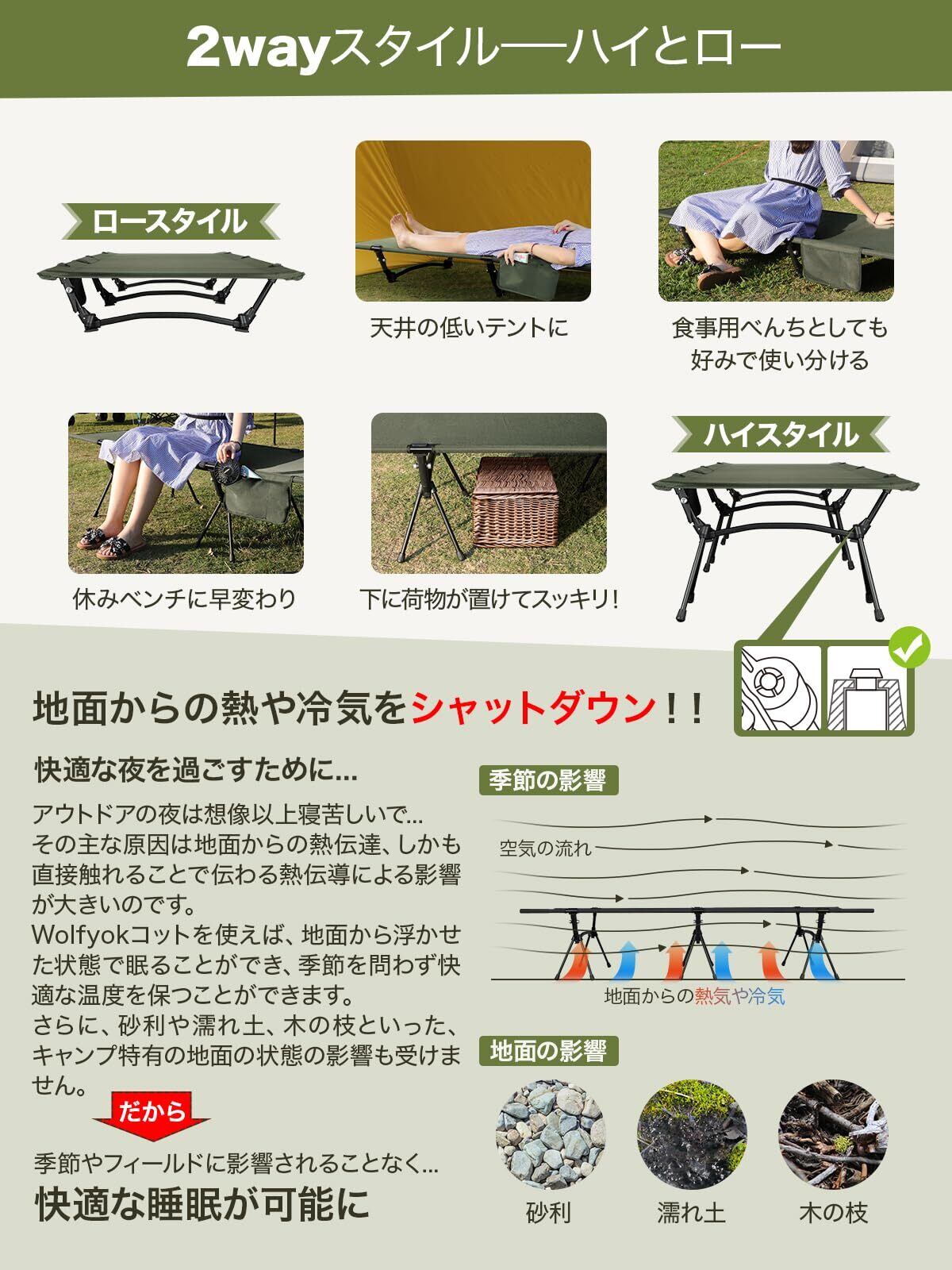 コット キャンプ 2way 軽量 【高密度1000Dオックスフォード・寝心地も耐久性もあり】 150KG高耐荷重 折りたたみ 小物収納 ハイ/ロー切替可能 wolfyok outdoors(ウルフヨックアウトドアーズ) アウトドアベッド 寝心地 通気性 撥水素材 超軽量航空機素材 バッグアジャスタブル コット 防災 自宅用 オフィス 収納バッグ付き 【国内ブランド】 【東京発ブランド】 オリーブ