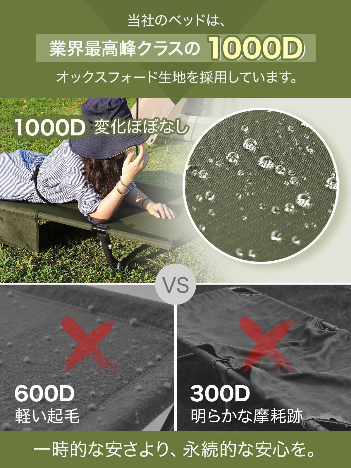 【1000D高密度・撥水生地・財布に優しい】1000Dオックスフォードの耐久性が優れ、登山、花火大会 、運動会、お花見などの日常行事に限らず、防災など緊急の場合も大活躍します。長期間使っても丁度良い弾力性、落色や変形等しませんので5年以上使用寿命もあります。また、生地の厚みが増したことで耐久性と地面からの冷気と暖気をシャットダウンする性能がアップしました。 ※300Dの場合は防水仕様が出来ないため、さまざまな天候やシーンに対応できず、変形したら地面への接触してしまい使用できない、最大1年ほどで壊れる恐れがあります。お財布に優しく、耐久性と寝心地から見れば、1000Dオックスフォードのキャンプコットは最適かつ経済的です。