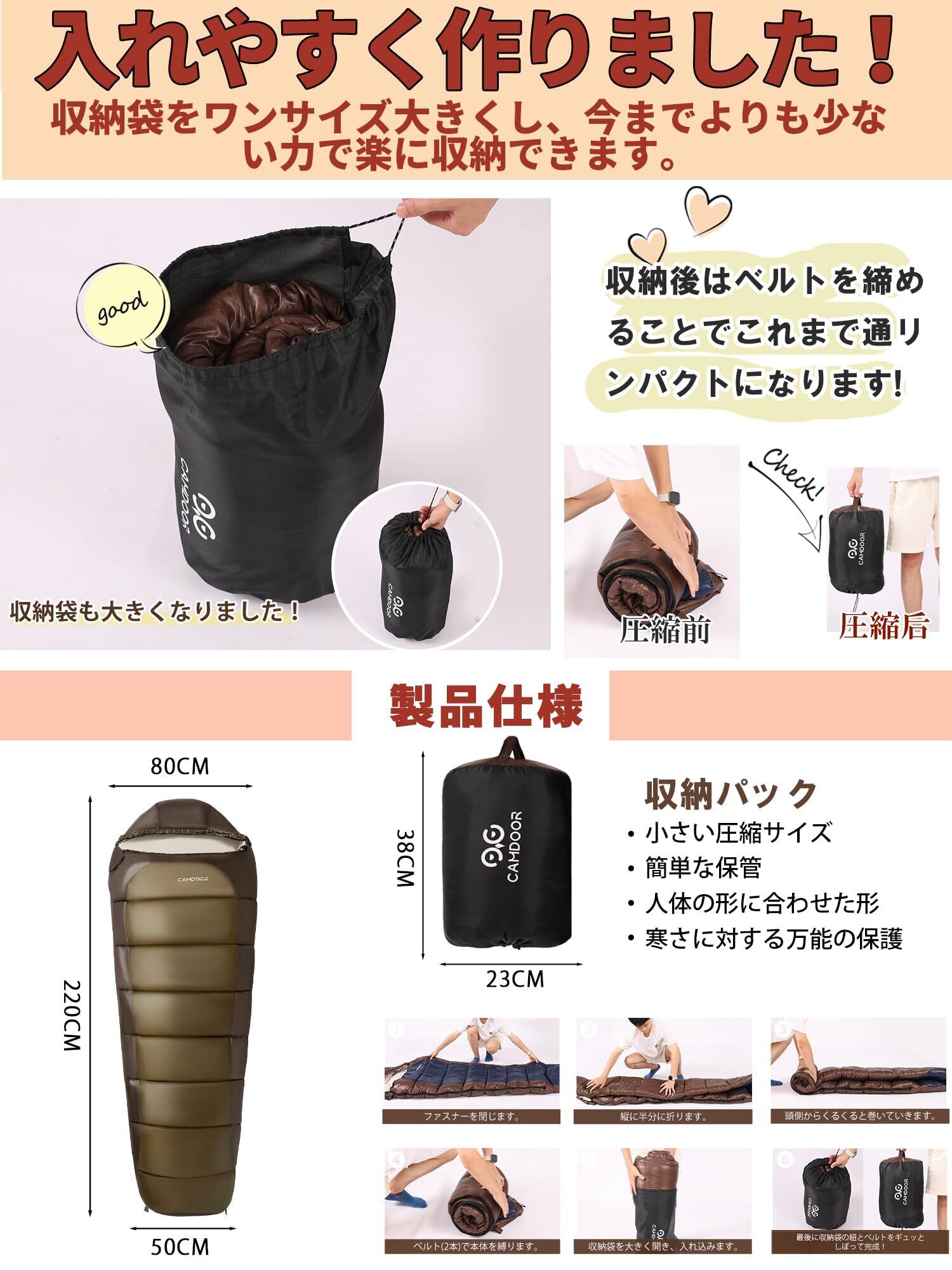 ■【冬のアウトドアに必携のシュラフ!】CAMDOORの寝袋は、寒い季節でも快適に眠れるように設計された高機能シュラフです。マミー型のデザインにより、体温をしっかり保ち、厳しい寒さからあなたを守ります!