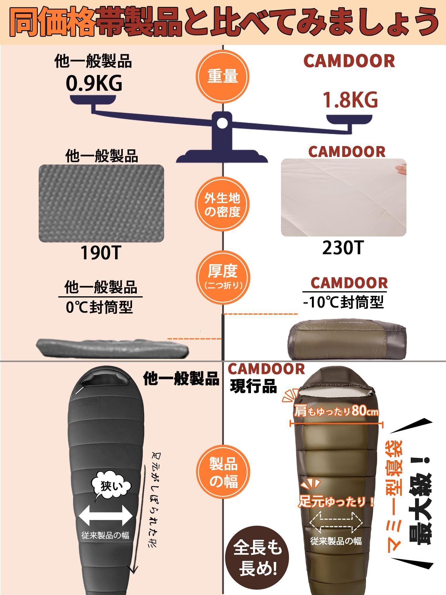 【新着商品】寝袋 冬用 シュラフ 【ショルダーウォーマー付・230T防水】 CAMDOOR 多機能 シュラフ 1.8kg 2.2kg マミー型 快適温度‐11-25℃耐寒