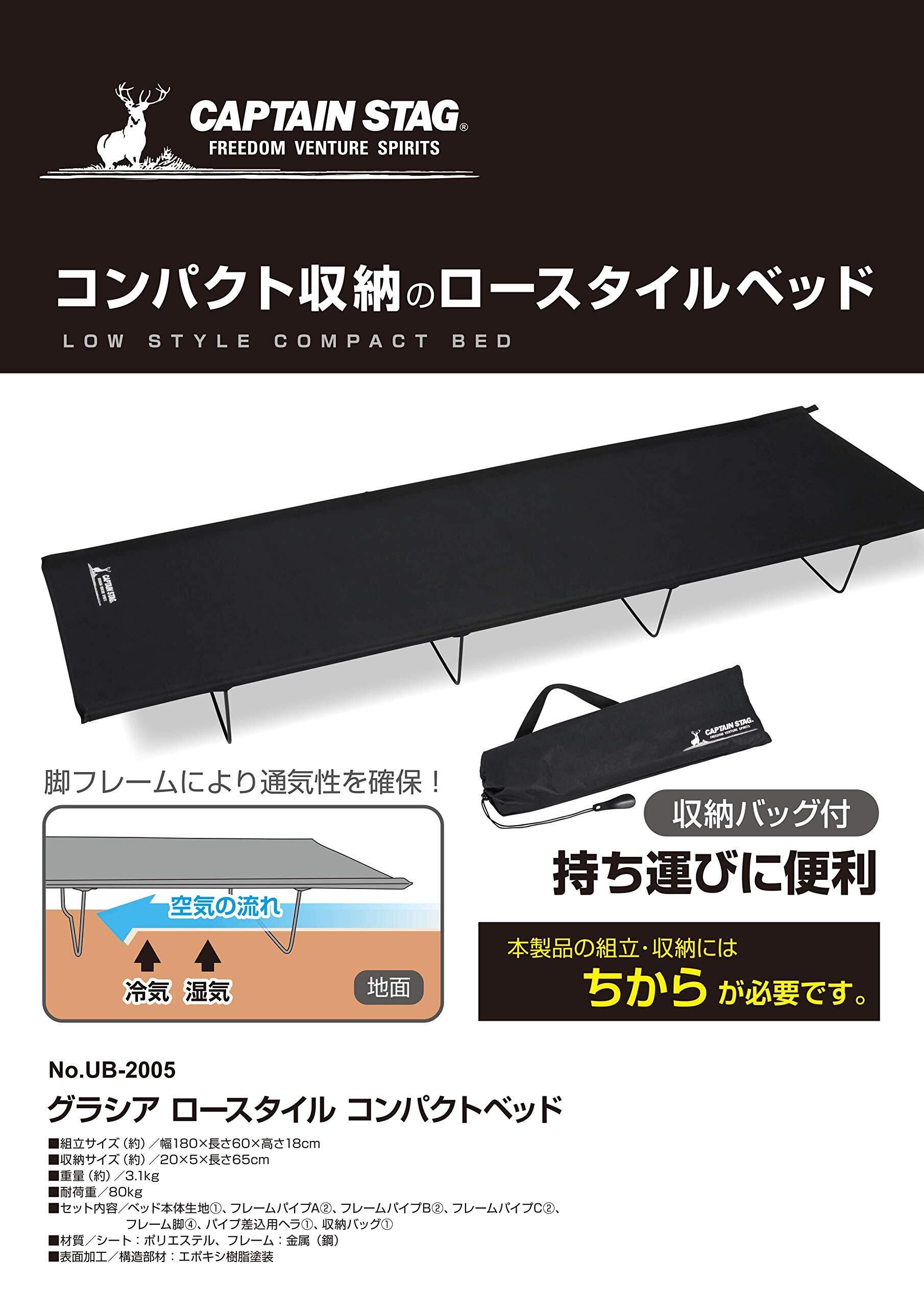 【限定セール】 キャプテンスタッグ(CAPTAIN STAG) アウトドアベッド コット ロースタイルコンパクトベッド 収納バッグ付き 【ブラック/カーキ】 UB-2005/UB-2008