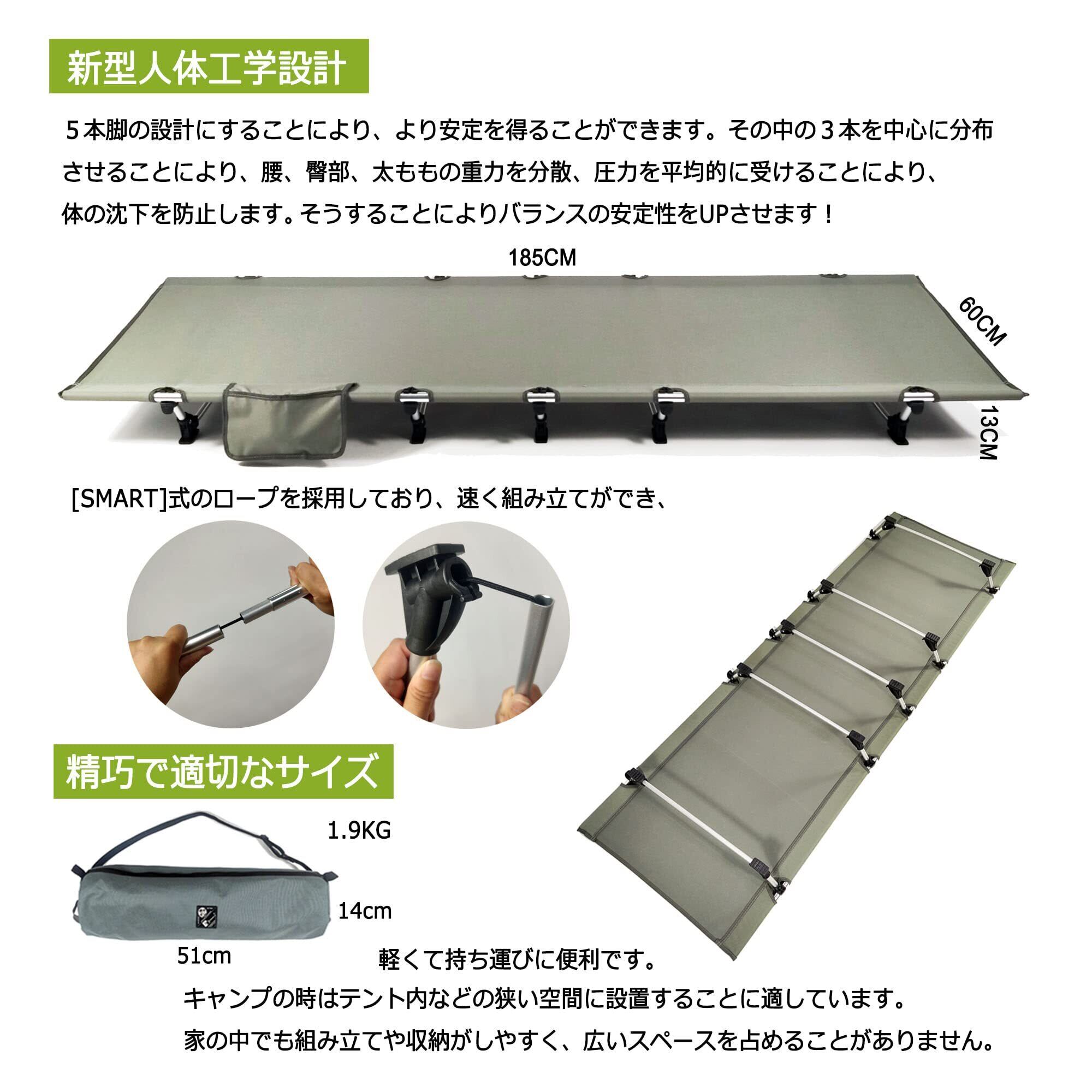 【商品仕様】使用時サイズ:(約)185cm×60cm×13cm 。収納時サイズ:(約)51cm×14cm×9cm。重量:1.9kg、耐荷重:150kg。材質:7075アルミニウム合金+600Dオックスフォード布。良質な材料を使用しており、コットの耐久性も問題ございません。