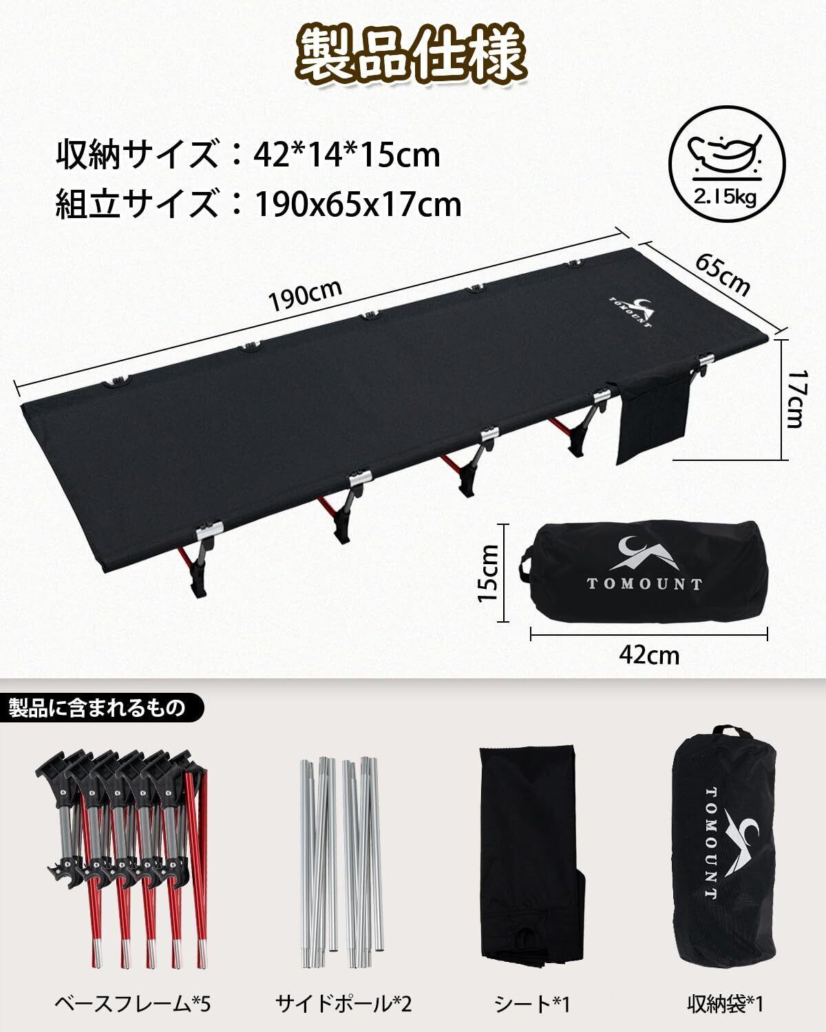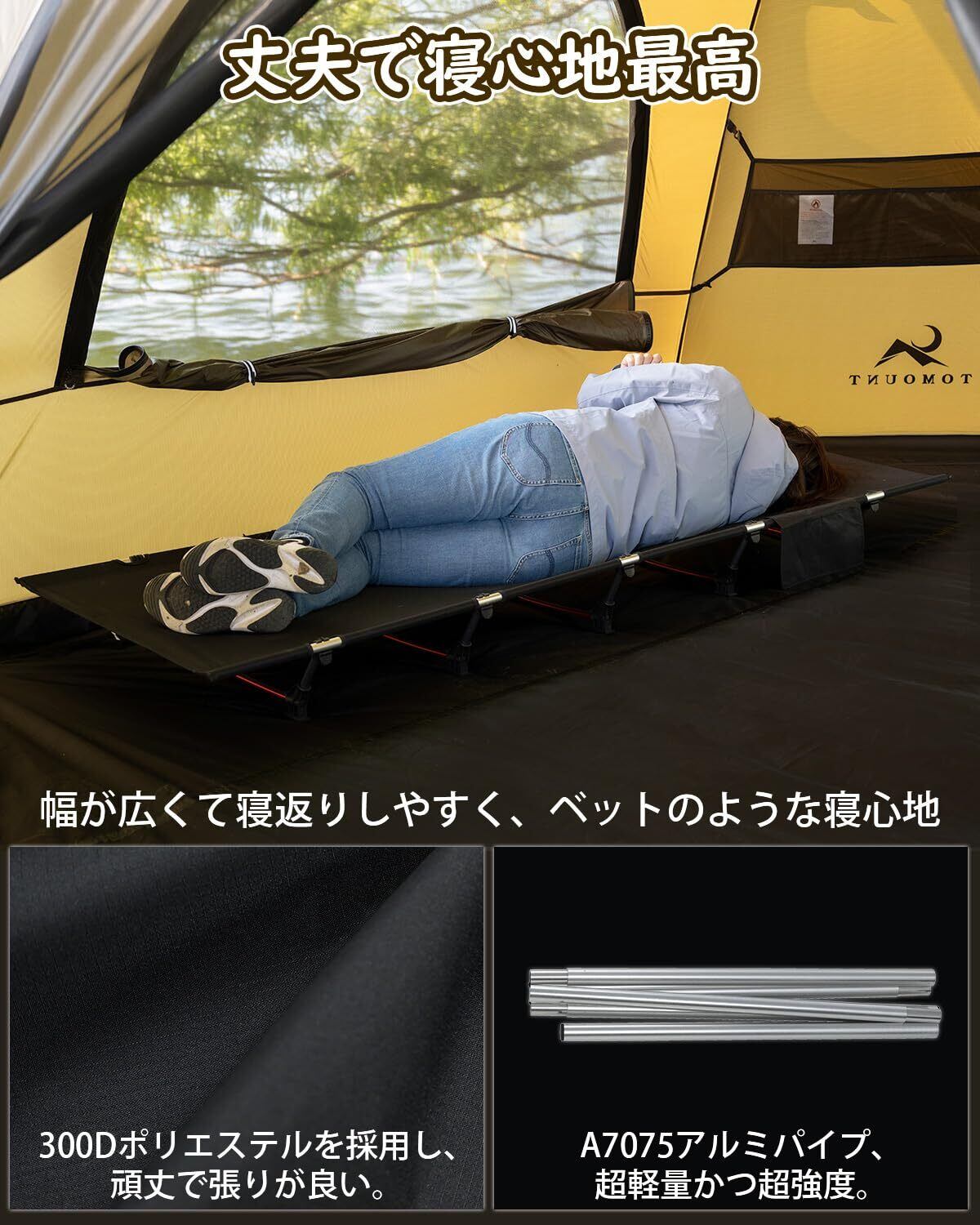 【特別価格】トモウント 折りたたみ式ベッド キャンプコット ローコット アウトドアベッド 軽量 コンパクト 静音性 通気性 幅広く キャンプベッド 防水 耐荷重150kg (ブラック)